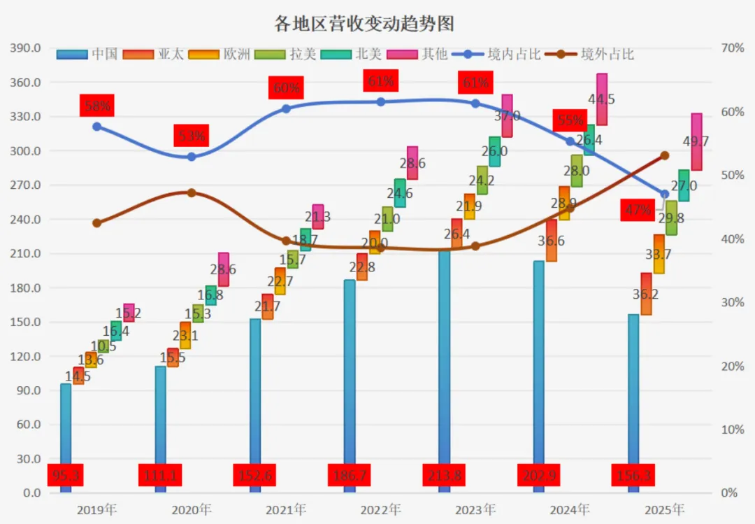 国际业务实现收入176.50亿元,同比增长7.40%,占公司总营收比重提升至53%。其中,欧洲市场在2024年高增长的基础上,2025年进一步实现了17%的增长。同时,国际新兴业务实现同比增长近30%。