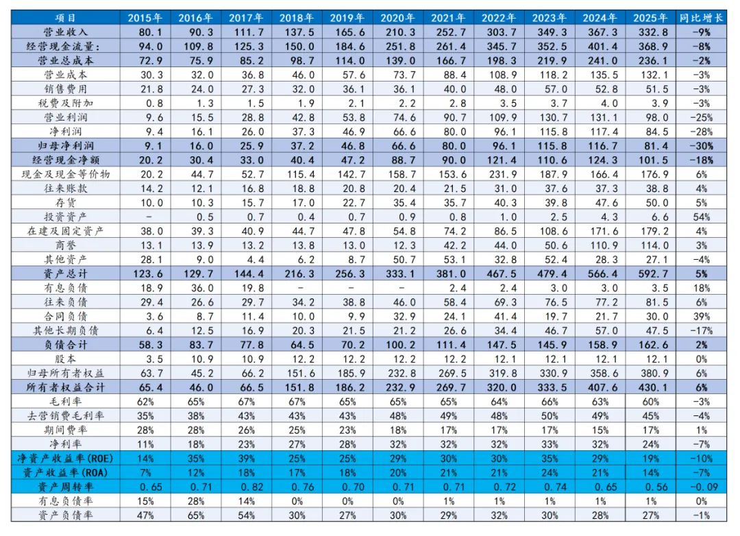 2025年全年业绩:营收332.82亿元,同比下降9.38%,净利润84.51亿元,同比下降28%。