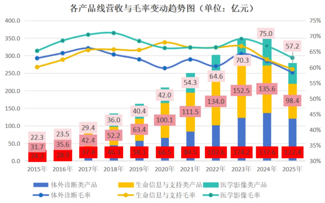 公司的三大产品线毛利率均在2023年后,出现了连续下滑,体外诊断由64.3%降至58.3%、生命信息与支持由66.8%降至59.4%、医学影像由69.1%降至63.1%,降幅都在6个百分点以上。公司整体毛利率也由2023年的66.2%降至2025年的60.3%,去费毛利率由50%降至45%。短期看,公司的盈利能力处于下降的趋势,三大产品线的毛利率都创了近10年新低。