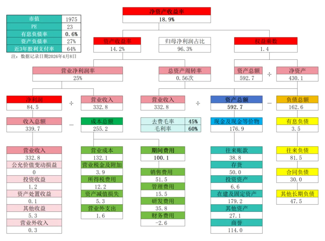 2.净资产收益率(ROE)拆解:不对比往年,几乎不存在有息负债,资产负债率27%的情况下,ROE18.9%,仍是非常不错的水平
