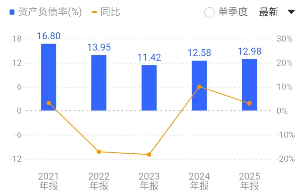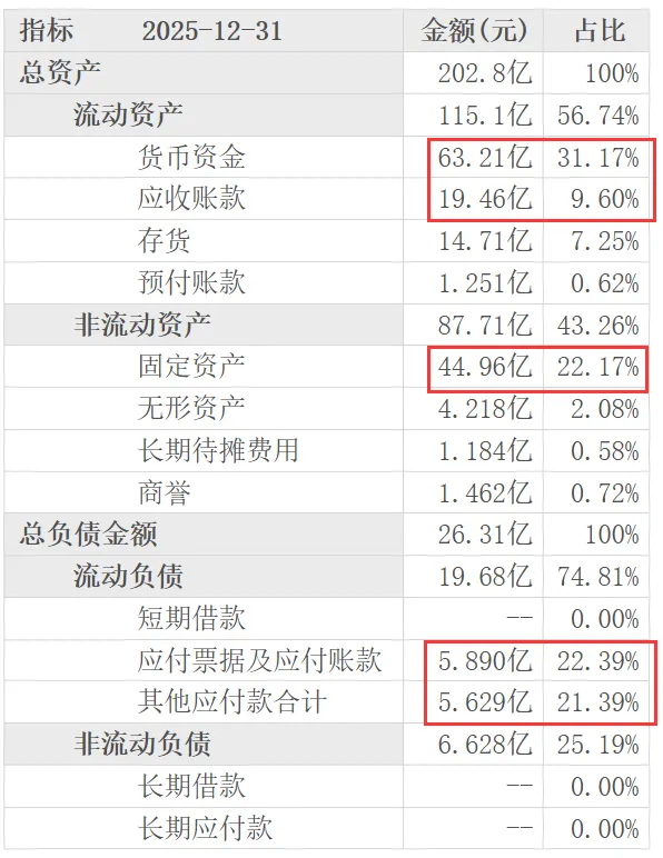 2025年底的资产负债表数据,总资产202亿,总负债26亿。其中货币资金63亿,应收账款19亿,固定资产44.9亿,存货14亿。应付账款11亿多,没有有息负债。