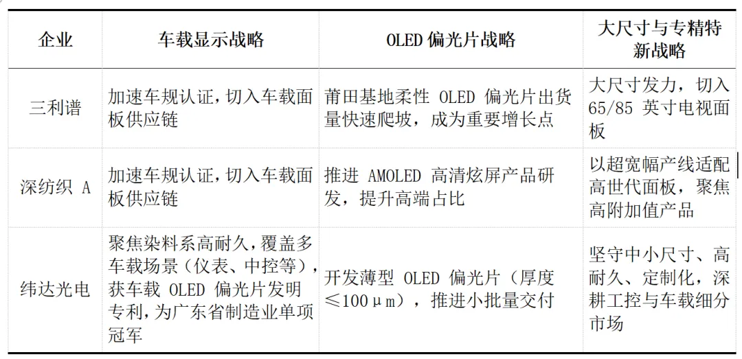 深纺织A、三利谱成功打入京东方、华星光电、LGD 等主流面板厂供应链,本土企业话语权持续提升。普通偏光片国产化率已近饱和,接下来的重点,是攻克车载、OLED 等高端领域。