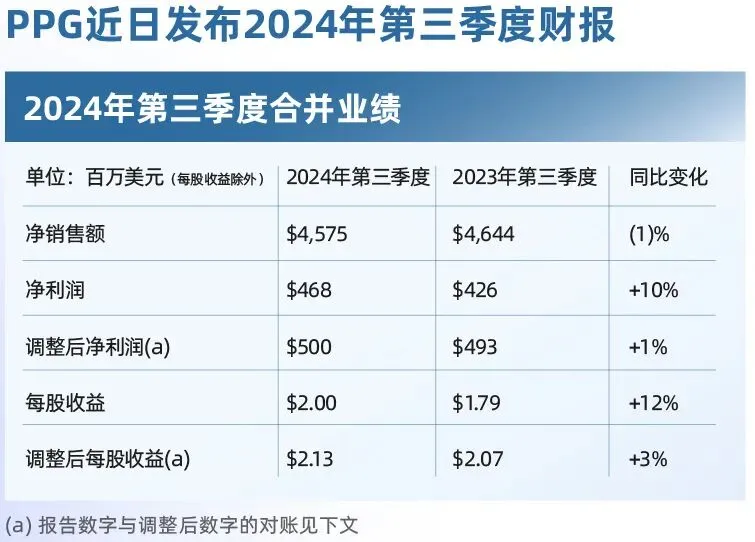 PPG董事长兼首席执行官Tim Knavish在评价2024年第三季度财务业绩时表示: