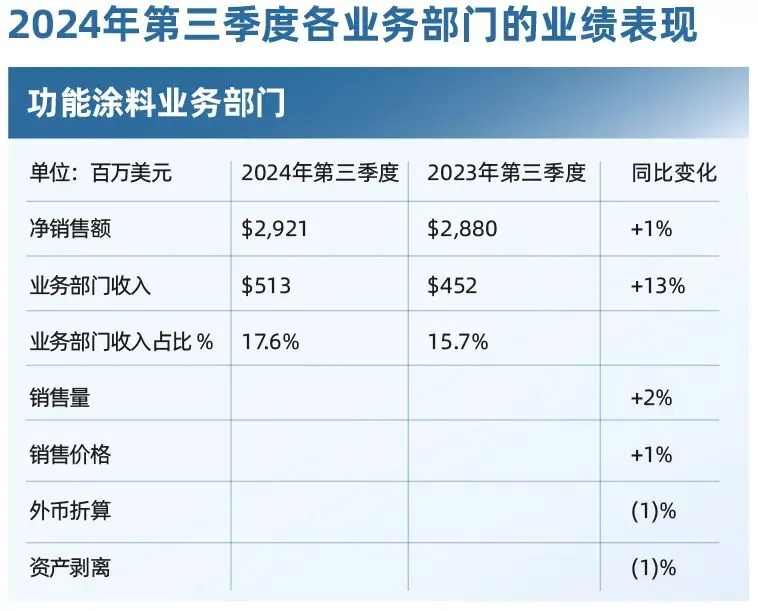 功能涂料业务部门的净销售额实现增长,主要得益于销售量和销售价格上涨,但被交通解决方案业务非北美部分的剥离和不利的外币折算部分抵消。