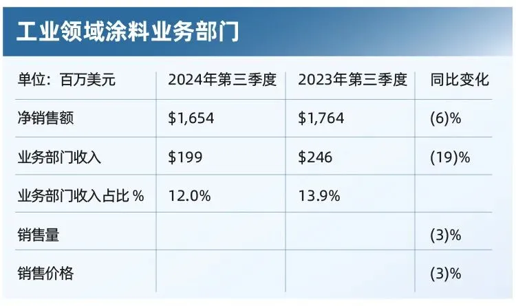 与2023年第三季度相比,工业涂料业务部门的净销售额有所下降,原因是某些基于指数的客户合同导致销售量和销售价格下降。