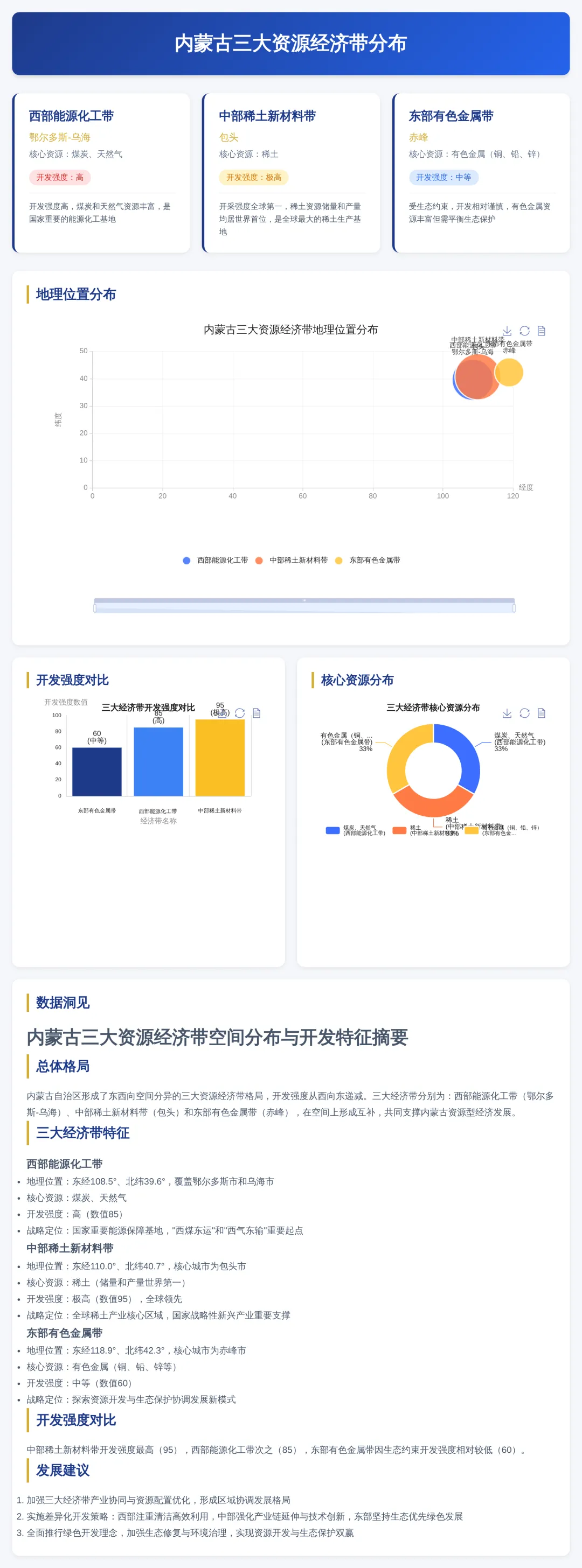 三大资源经济带:西部能源化工带(鄂尔多斯-乌海)开发强度高;中部稀土新材料带(包头)开采强度全球第一;东部有色金属带(赤峰)受生态约束。约40%面积纳入草原生态红线,未来可能扩大至50%。