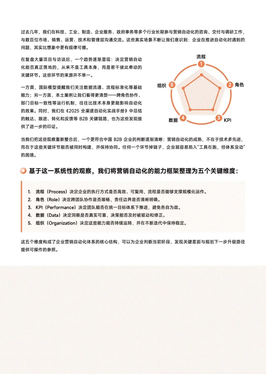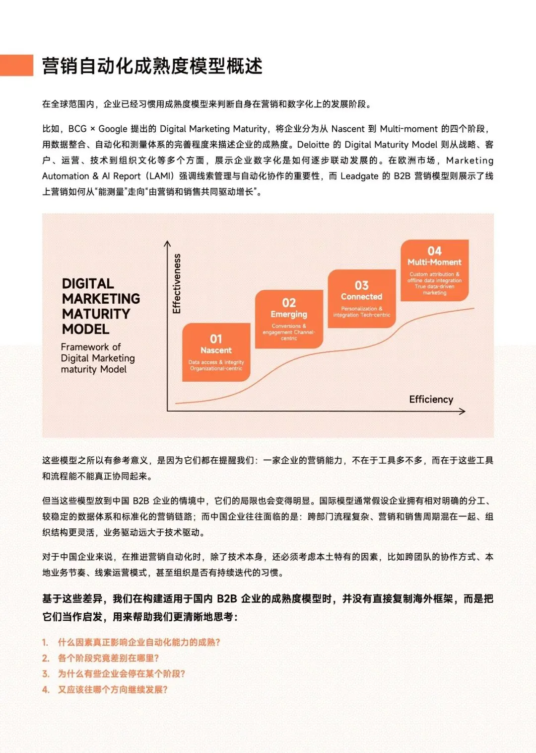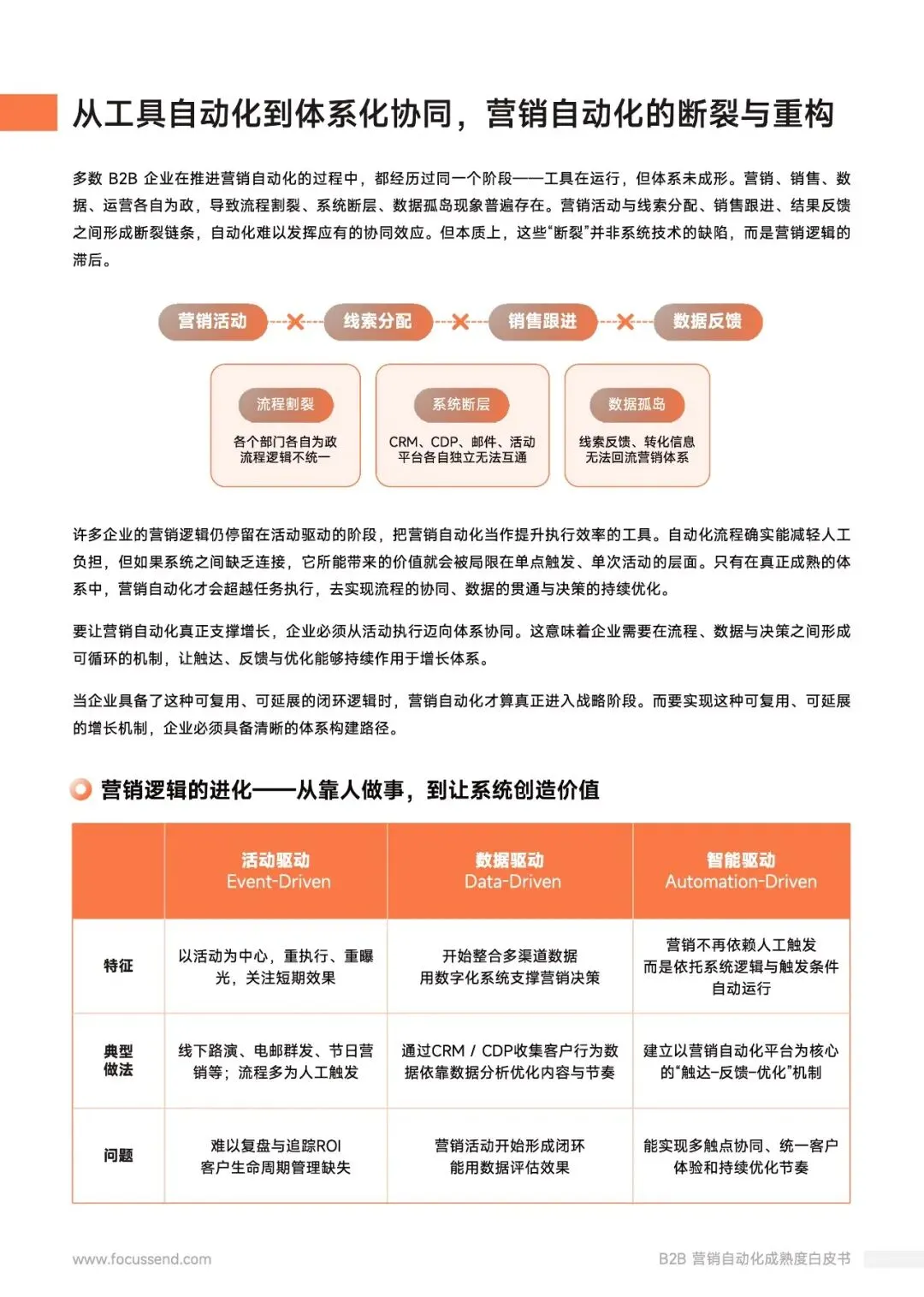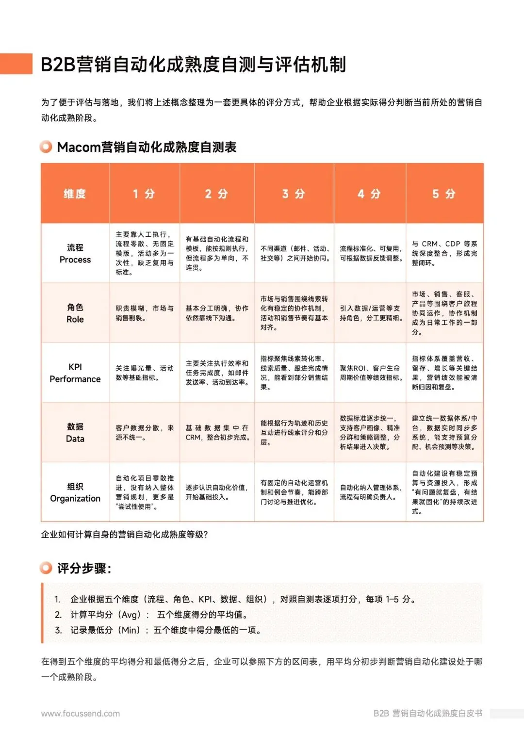 B2B营销自动化正从“效率工具”升级为“增长操作系统”,其成熟度决定了企业在逆周期中的韧性。报告指出,85%的企业在预算收紧下仍保持或增加营销自动化投入,但多数企业卡在“工具在跑、体系没动”的困境。Focussend提出的Macom模型将成熟度分为五级,并揭示瓶颈往往不在技术,而在角色与组织维度——大量企业数据、流程得分尚可,却因缺少跨部门协同的Owner,链路始终跑不顺。一个生物医药案例显示,数据维度仅得1分,导致无法支撑分层触达;而某科技企业因角色维度仅2分,被校正回Level3。从人工到自动化易,从自动到协同难,真正的分水岭是“有没有人为全链路负责”。