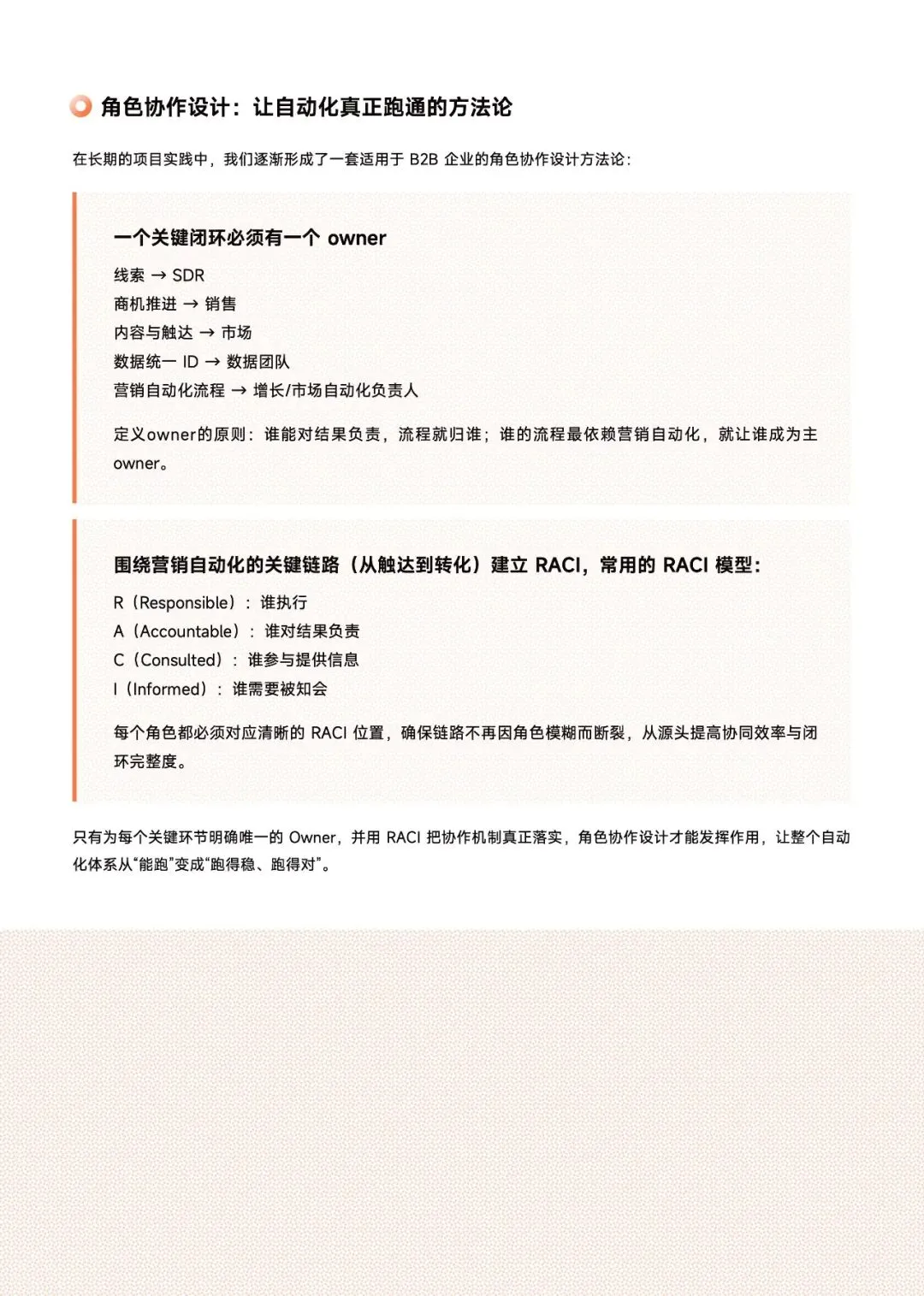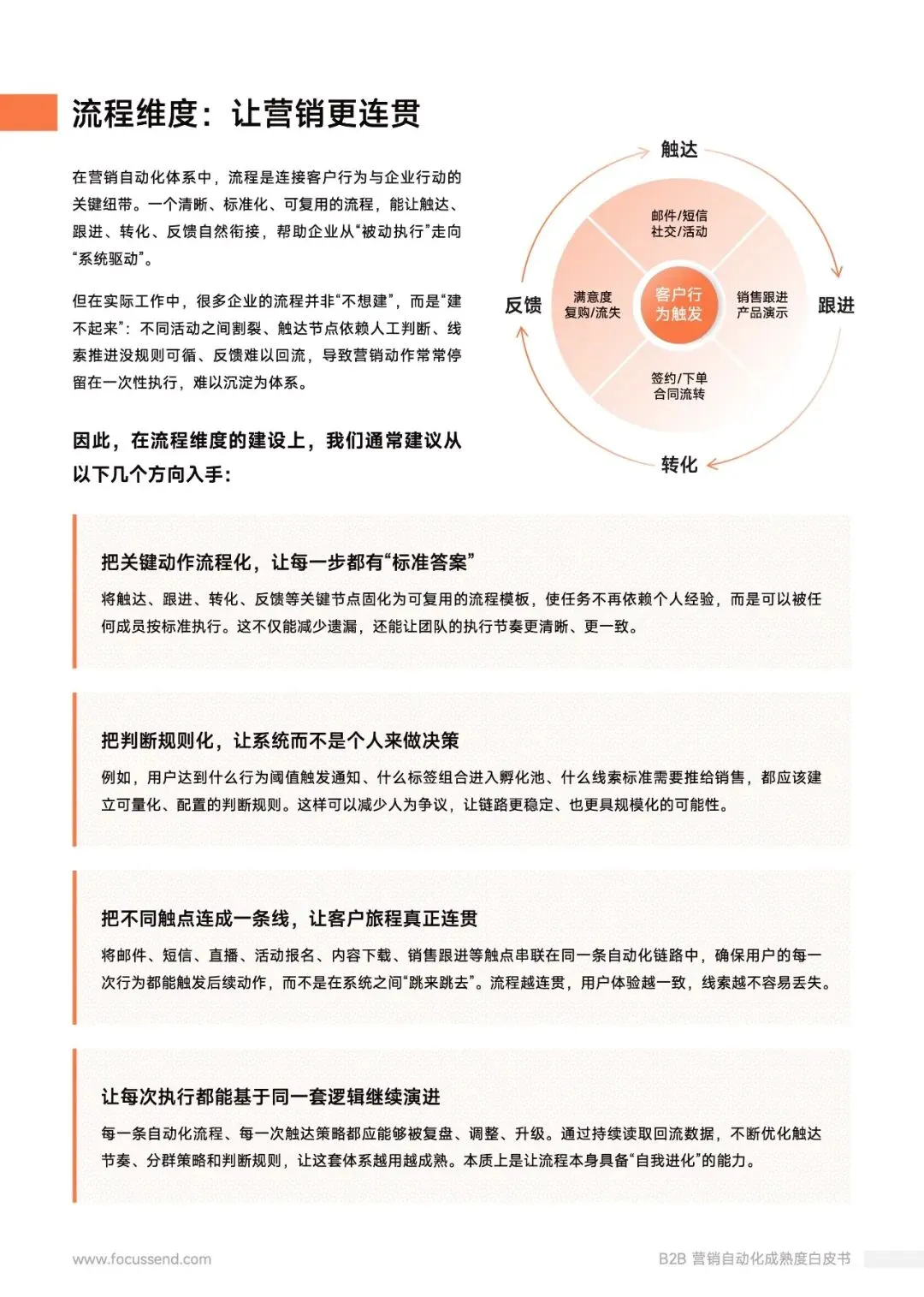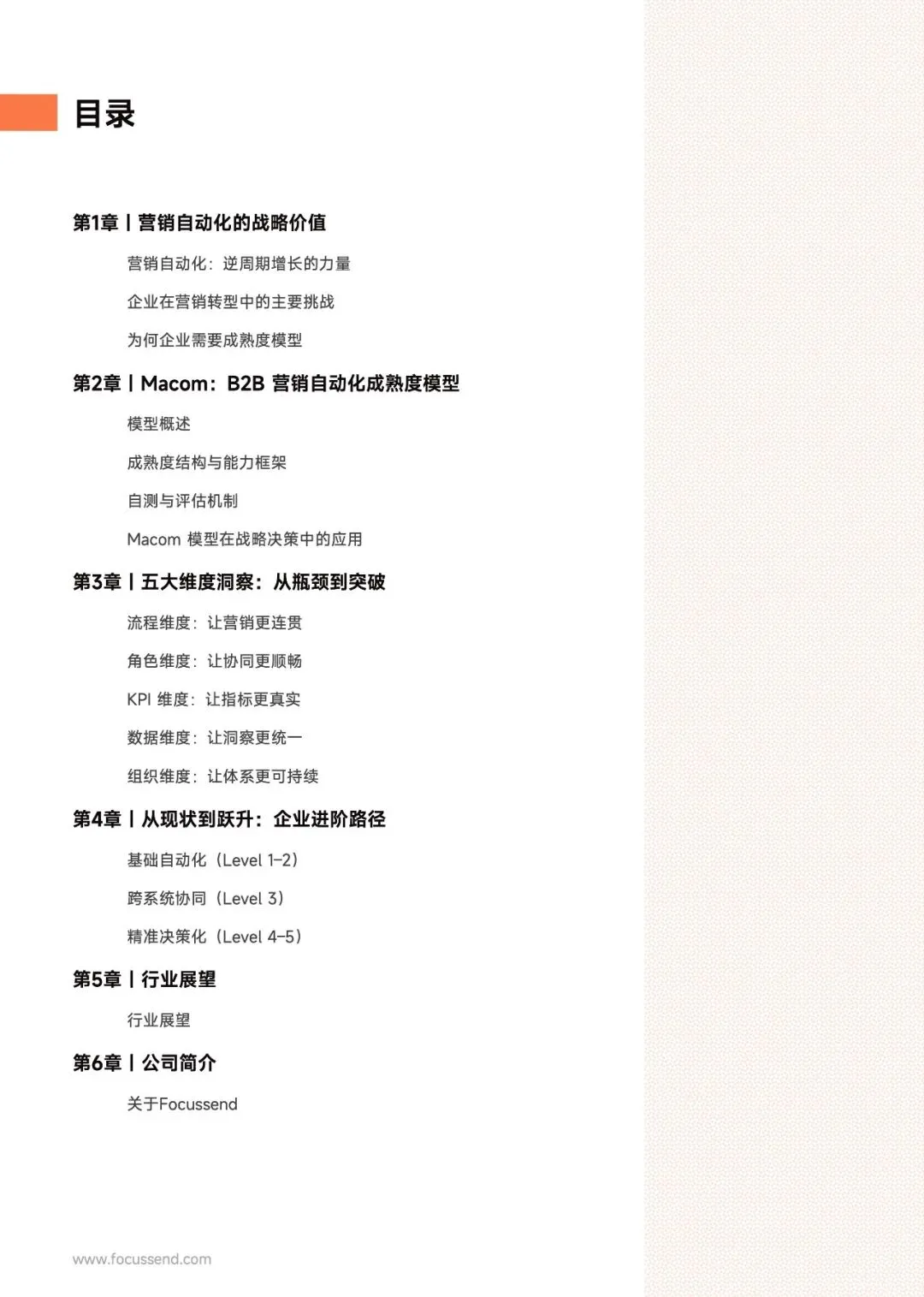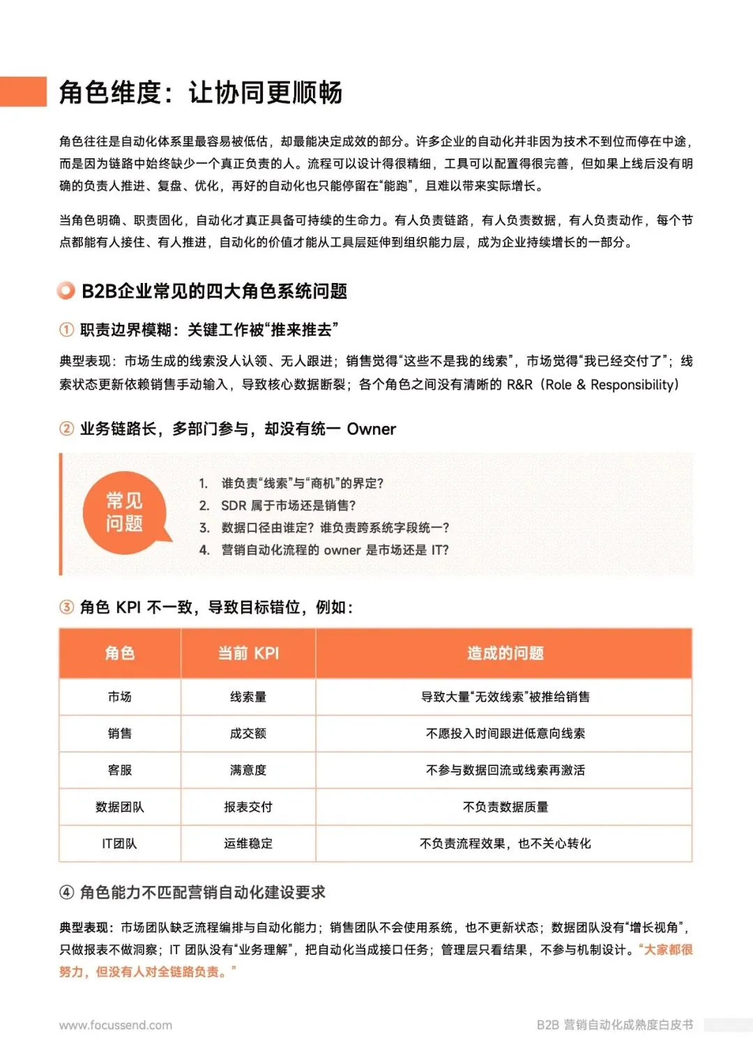 B2B营销自动化正从“效率工具”升级为“增长操作系统”,其成熟度决定了企业在逆周期中的韧性。报告指出,85%的企业在预算收紧下仍保持或增加营销自动化投入,但多数企业卡在“工具在跑、体系没动”的困境。Focussend提出的Macom模型将成熟度分为五级,并揭示瓶颈往往不在技术,而在角色与组织维度——大量企业数据、流程得分尚可,却因缺少跨部门协同的Owner,链路始终跑不顺。一个生物医药案例显示,数据维度仅得1分,导致无法支撑分层触达;而某科技企业因角色维度仅2分,被校正回Level3。从人工到自动化易,从自动到协同难,真正的分水岭是“有没有人为全链路负责”。