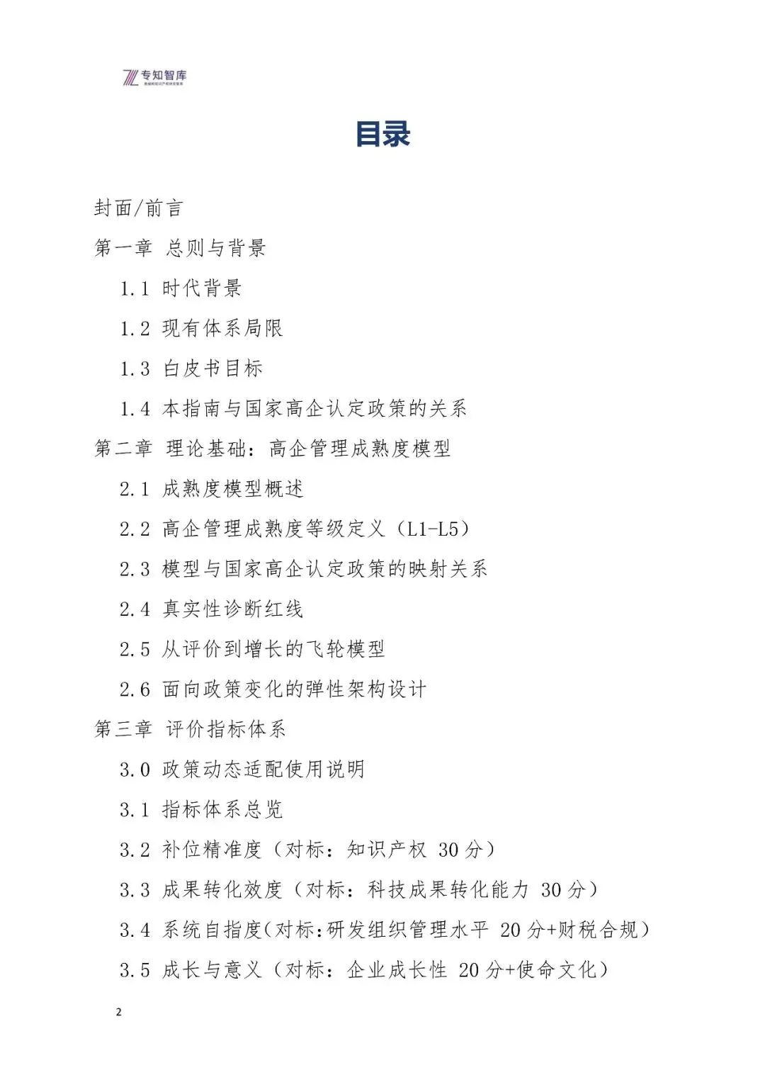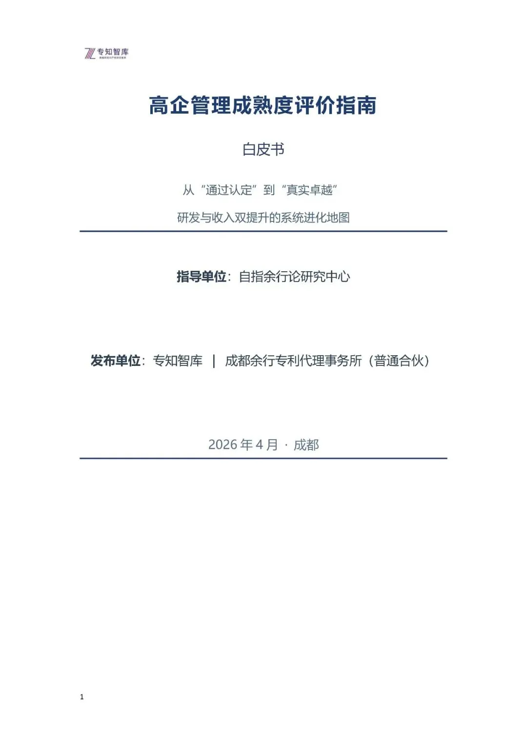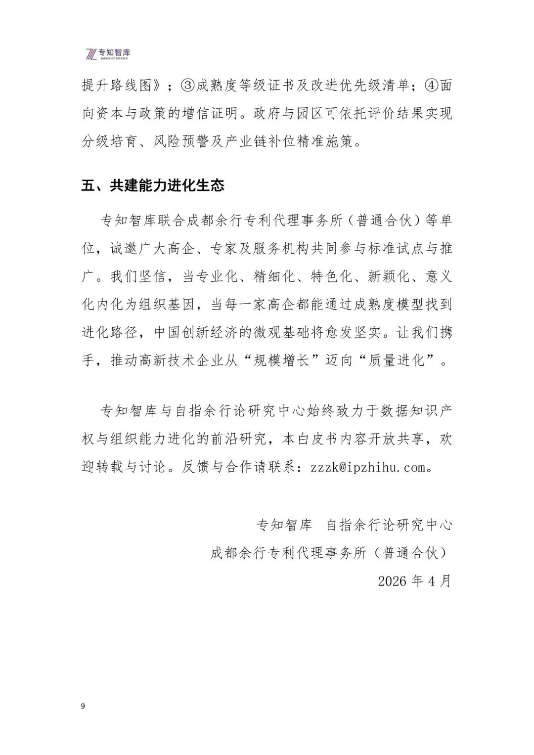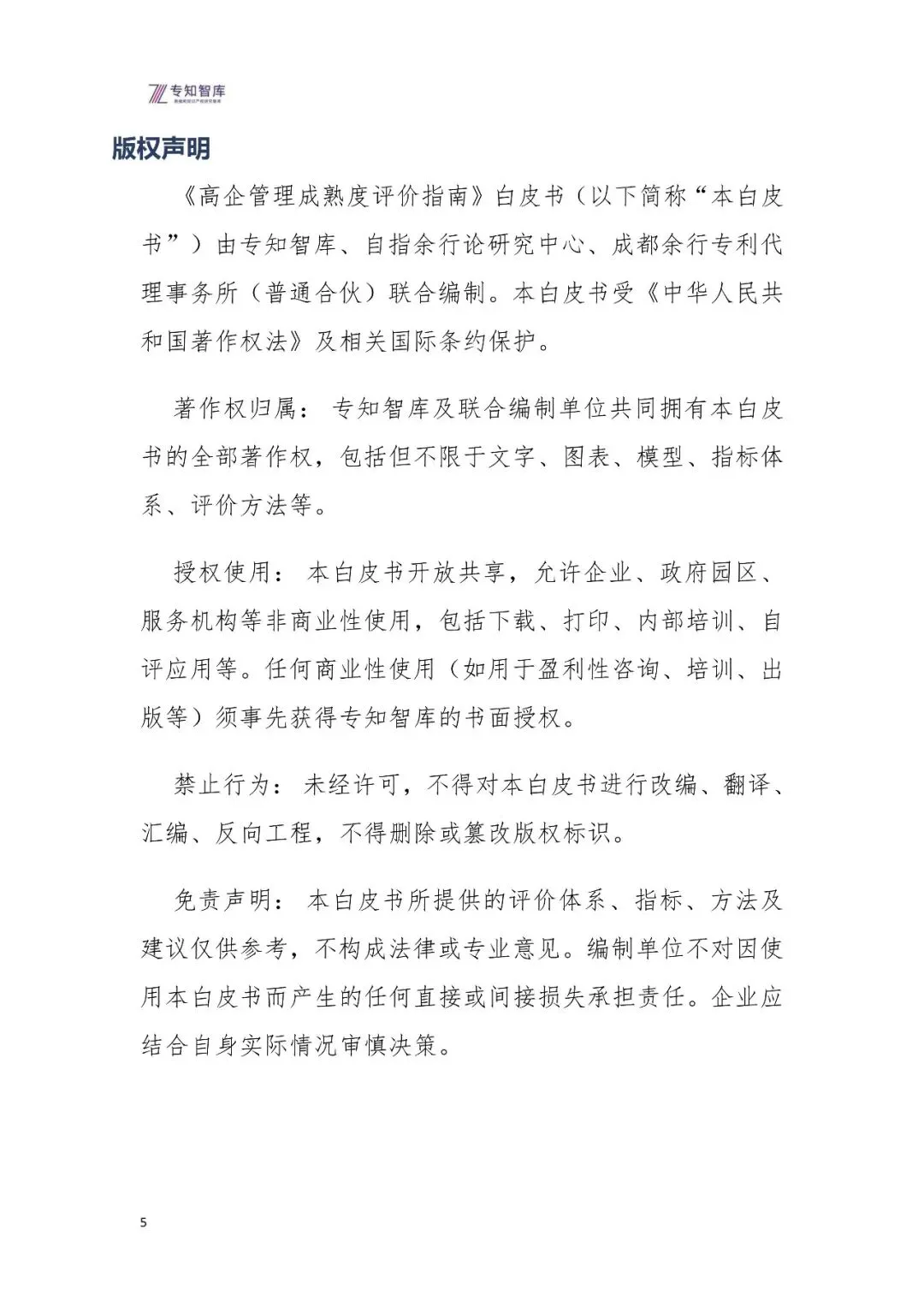 本白皮书由专知智库联合自指余行论研究中心、成都余行专利代理事务所(普通合伙)及多家高企共同研制,旨在推动中国高新技术企业从“规模增长”迈向“质量进化”。我们坚信,管理成熟度评价不仅是一套工具,更是一场关于组织能力建设的认知革命。诚邀广大高企、服务机构、科技管理部门共同参与试点、反馈迭代,让中国高企群体真正成为全球创新的引领力量。