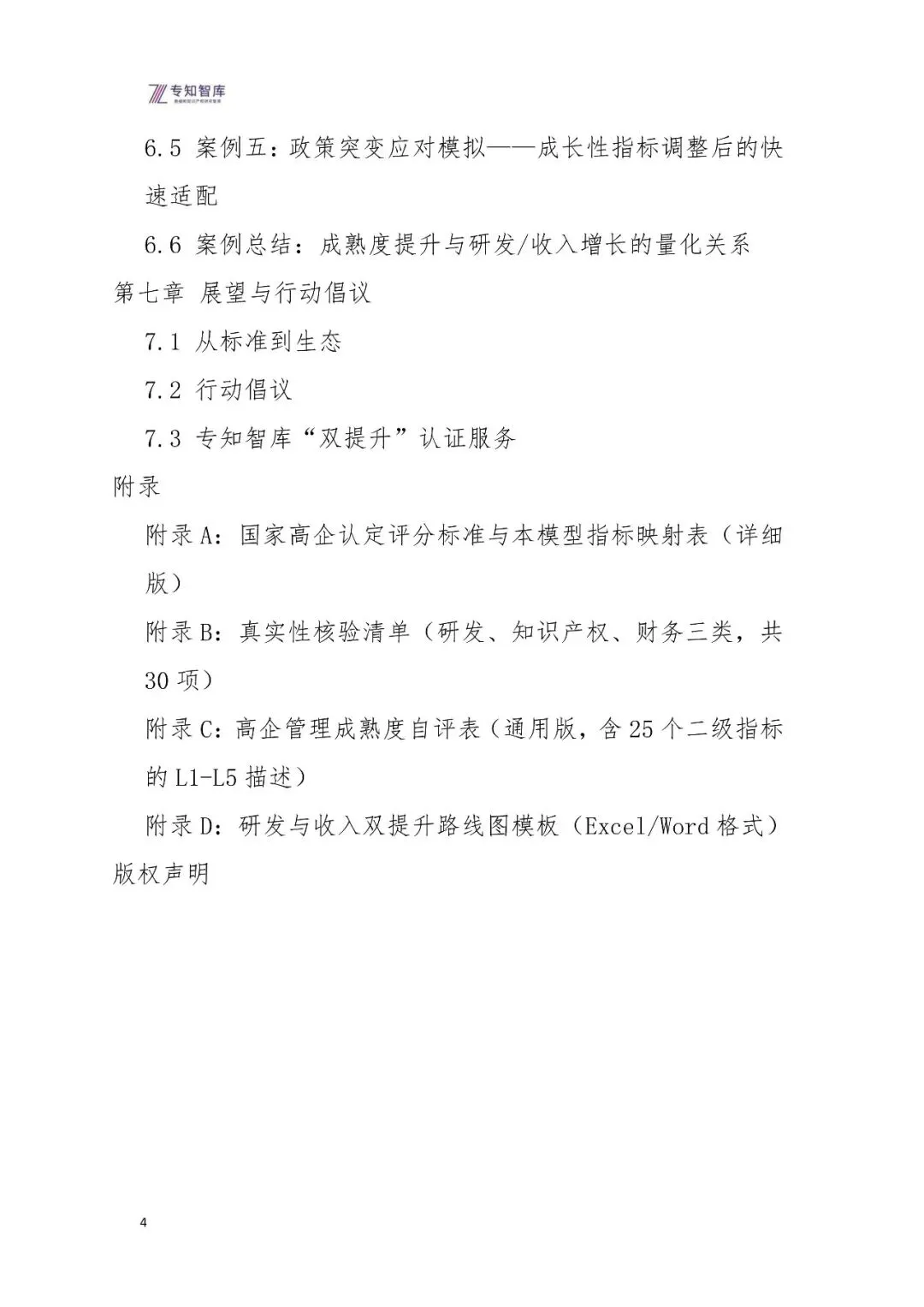 本白皮书共七章。第一章(总则与背景)阐述编写缘由、核心目标和政策关联。第二章介绍高企管理成熟度模型的理论基础、五维等级定义以及从评价到增长的飞轮模型。第三章详细拆解评价指标体系(5个一级指标、25个二级指标、100余项三级评分项),每个指标均配有1-5级行为锚定和真实性诊断要点。第四章提供评价流程、数据采集方法、真实性核验专项、双提升路线图自动生成逻辑以及政策变化时的快速重评机制。第五章展示结果应用场景(企业、政府园区、服务机构)和典型价值。第六章给出六个行业的模拟案例(含研发与收入数据对比)。第七章展望未来并发出行动倡议。附录包含自评表、政策映射表、适配指南等工具。建议读者首先利用附录自评表快速摸底,再根据短板重点阅读第三章相关指标解释和第四章改进措施,最后参考第六章案例设计本企业提升计划。