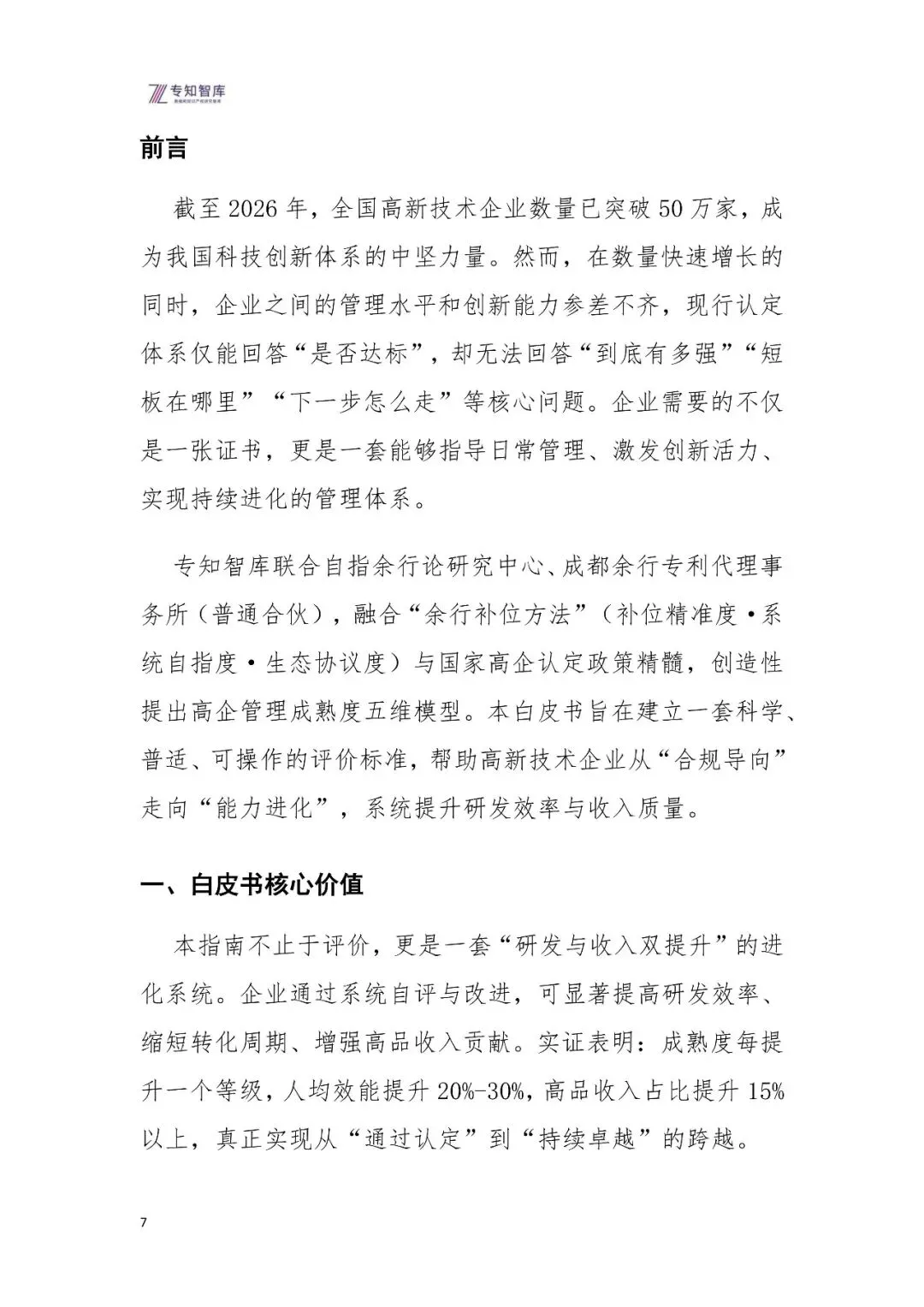 专知智库联合自指余行论研究中心、成都余行专利代理事务所(普通合伙),融合“余行补位方法”(补位精准度·系统自指度·生态协议度)与国家高企认定政策精髓,创造性提出高企管理成熟度五维模型。本白皮书旨在建立一套科学、普适、可操作的评价标准,帮助高新技术企业从“合规导向”走向“能力进化”,系统提升研发效率与收入质量。
