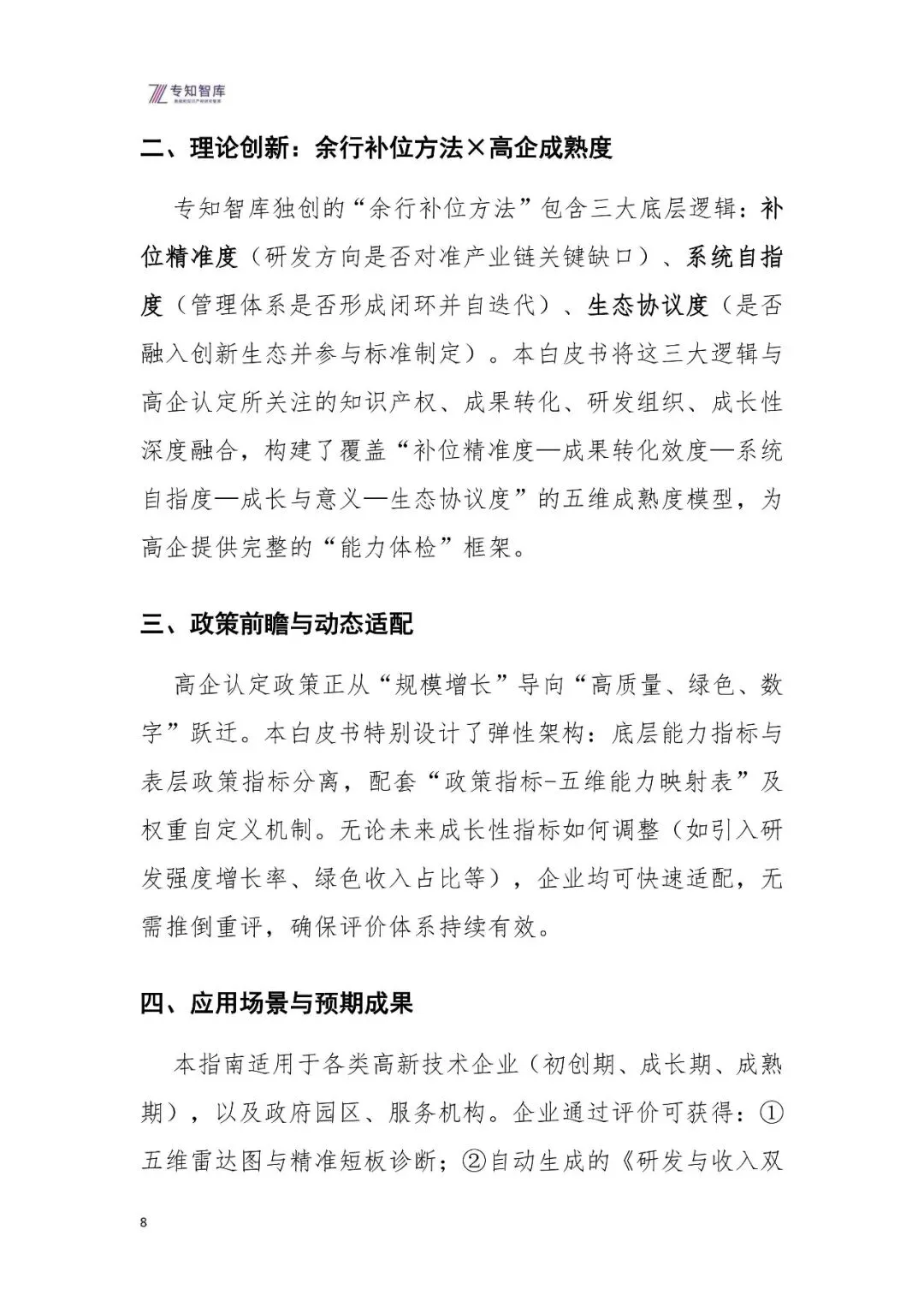 专知智库独创的“余行补位方法”包含三大底层逻辑:补位精准度(研发方向是否对准产业链关键缺口)、系统自指度(管理体系是否形成闭环并自迭代)、生态协议度(是否融入创新生态并参与标准制定)。本白皮书将这三大逻辑与高企认定所关注的知识产权、成果转化、研发组织、成长性深度融合,构建了覆盖“补位精准度—成果转化效度—系统自指度—成长与意义—生态协议度”的五维成熟度模型,为高企提供完整的“能力体检”框架。