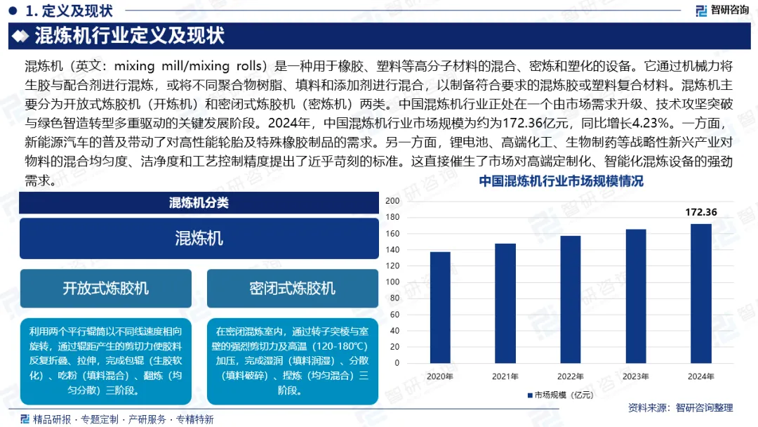 市场规模:中国混炼机行业正处在一个由市场需求升级、技术攻坚突破与绿色智造转型多重驱动的关键发展阶段。2024年,中国混炼机行业市场规模为约为172.36亿元,同比增长4.23%。一方面,新能源汽车的普及带动了对高性能轮胎及特殊橡胶制品的需求。另一方面,锂电池、高端化工、生物制药等战略性新兴产业对物料的混合均匀度、洁净度和工艺控制精度提出了近乎苛刻的标准。这直接催生了市场对高端定制化、智能化混炼设备的强劲需求。