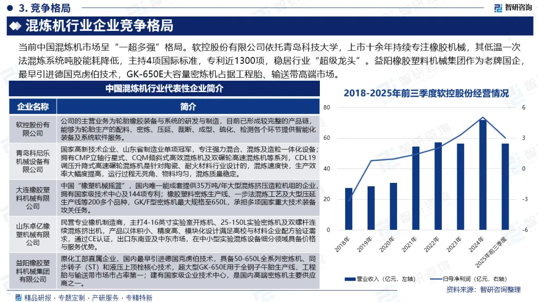 行业发展有利因素:钢材等原材料价格回落,直接降低机体成本,毛利率改善;新能源轮胎、锂电正负极、可降解塑料等新兴需求提供增量订单;国家“双碳”政策倒逼绿色炼胶,低温一次法、连续混炼享受节能补贴与碳减排收益。龙头企业通过技术积累(如软控股份主导4项国际标准)、产学研合作(如青岛科技大学背景)形成技术壁垒,国际化拓展空间广阔。