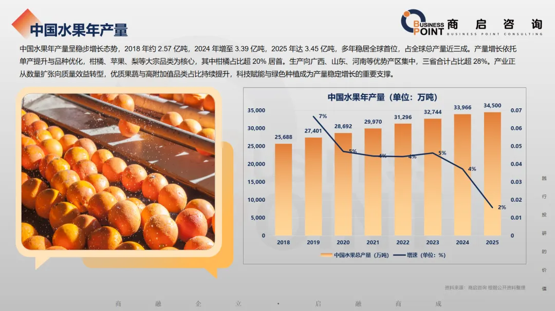中国水果年产量呈稳步增长态势,2018 年约 2.57 亿吨,2024 年增至 3.39 亿吨,2025 年达 3.45 亿吨,多年稳居全球首位,占全球总产量近三成。产量增长依托单产提升与品种优化,柑橘、苹果、梨等大宗品类为核心,其中柑橘占比超 20% 居首。生产向广西、山东、河南等优势产区集中,三省合计占比超 28%。产业正从数量扩张向质量效益转型,优质果蔬与高附加值品类占比持续提升,科技赋能与绿色种植成为产量稳定增长的重要支撑。