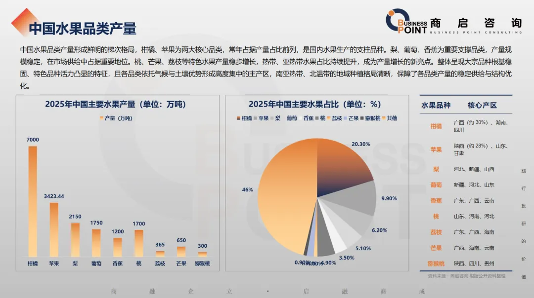 中国水果品类产量形成鲜明的梯次格局,柑橘、苹果为两大核心品类,常年占据产量占比前列,是国内水果生产的支柱品种。梨、葡萄、香蕉为重要支撑品类,产量规模稳定,在市场供给中占据重要地位。桃、芒果、荔枝等特色水果产量稳步增长,热带、亚热带水果占比持续提升,成为产量增长的新亮点。整体呈现大宗品种根基稳固、特色品种活力凸显的特征,且各品类依托气候与土壤优势形成高度集中的主产区,南亚热带、北温带的地域种植格局清晰,保障了各品类产量的稳定供给与结构优化。