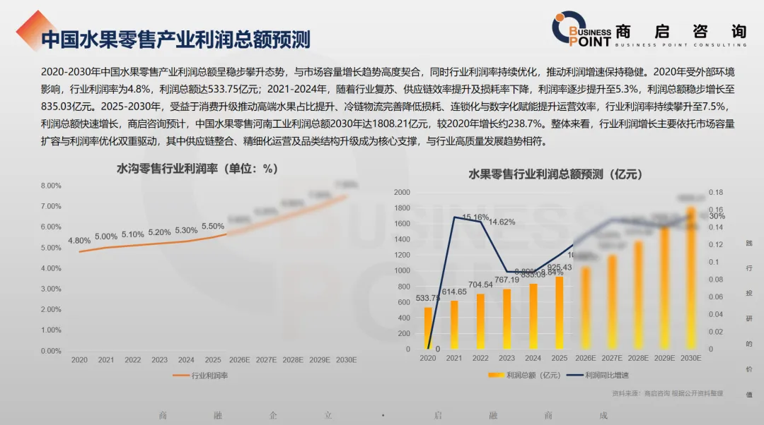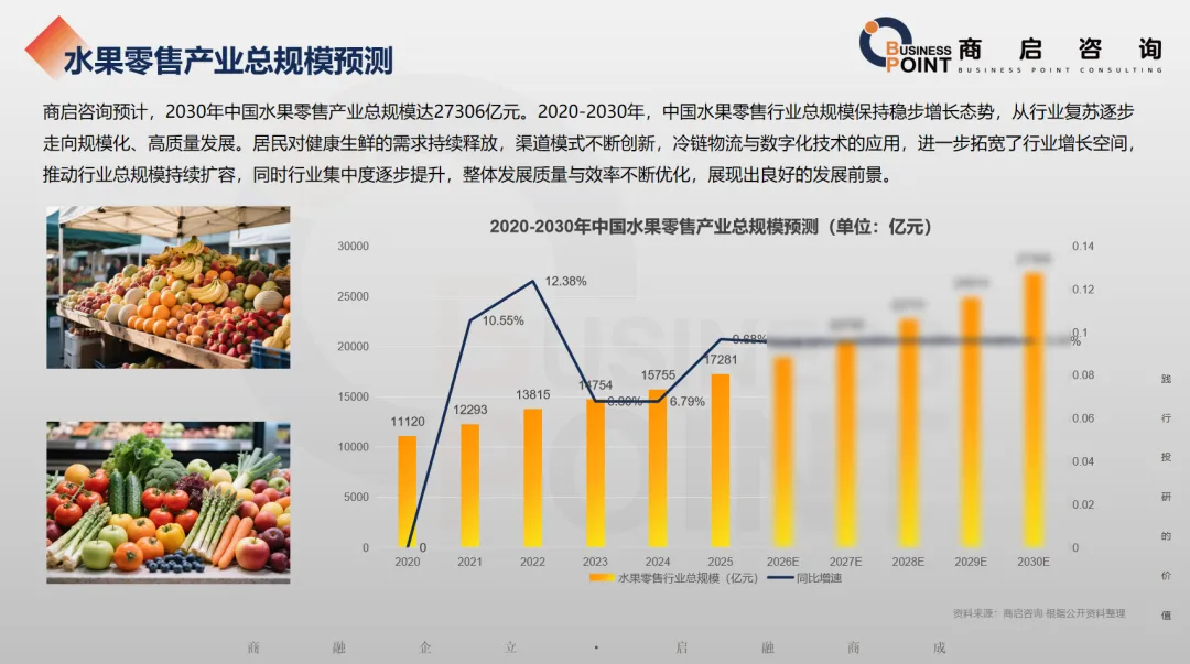 商启咨询预计,2030年中国水果零售产业总规模达27306亿元。2020-2030年,中国水果零售行业总规模保持稳步增长态势,从行业复苏逐步走向规模化、高质量发展。居民对健康生鲜的需求持续释放,渠道模式不断创新,冷链物流与数字化技术的应用,进一步拓宽了行业增长空间,推动行业总规模持续扩容,同时行业集中度逐步提升,整体发展质量与效率不断优化,展现出良好的发展前景。