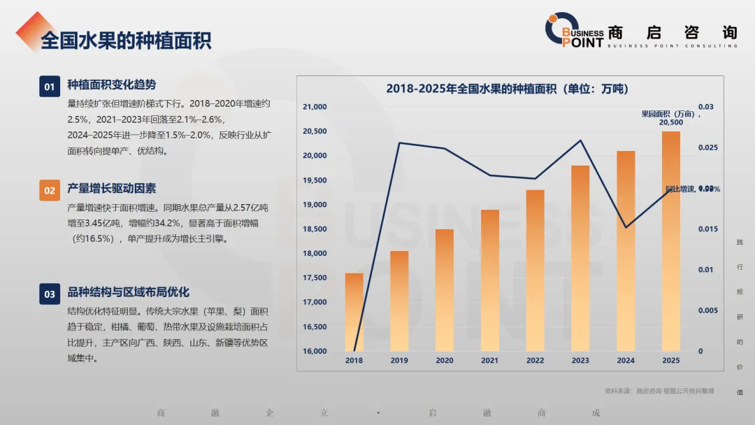 这一发展态势得益于居民健康消费需求提升、人均鲜果消费量增长、水果零售价格稳步上涨及线上渠道快速渗透,同时乡村振兴战略支撑、冷链物流完善与产业链升级,进一步推动行业实现规模化、高质量发展,水果在家庭生鲜支出中的占比持续提升,成为生鲜消费的核心品类之一。