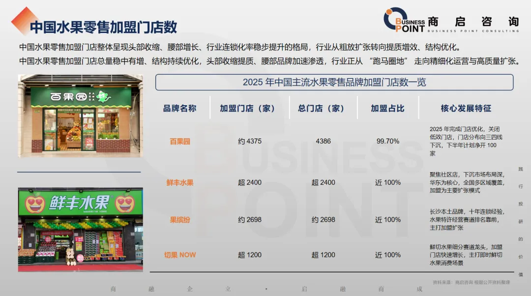 中国水果零售加盟门店整体呈现头部收缩、腰部增长、行业连锁化率稳步提升的格局,行业从粗放扩张转向提质增效、结构优化。