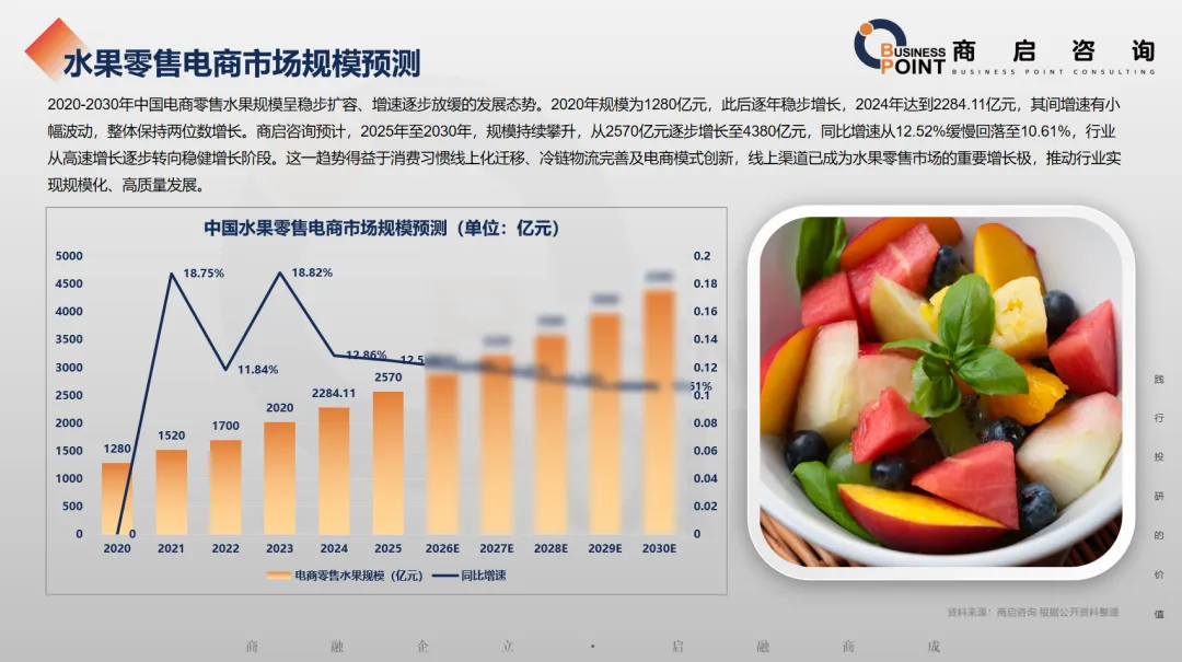 2020-2030年中国电商零售水果规模呈稳步扩容、增速逐步放缓的发展态势。2020年规模为1280亿元,此后逐年稳步增长,2024年达到2284.11亿元,其间增速有小幅波动,整体保持两位数增长。商启咨询预计,2025年至2030年,规模持续攀升,从2570亿元逐步增长至4380亿元,同比增速从12.52%缓慢回落至10.61%,行业从高速增长逐步转向稳健增长阶段。这一趋势得益于消费习惯线上化迁移、冷链物流完善及电商模式创新,线上渠道已成为水果零售市场的重要增长极,推动行业实现规模化、高质量发展。
