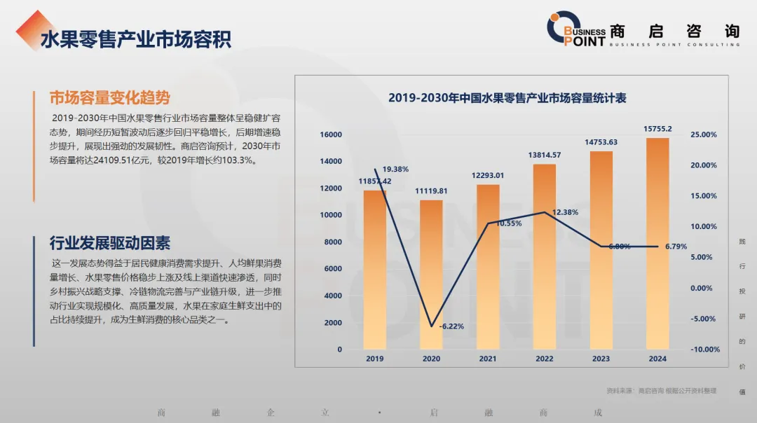 2019-2030年中国水果零售行业市场容量整体呈稳健扩容态势,期间经历短暂波动后逐步回归平稳增长,后期增速稳步提升,展现出强劲的发展韧性。商启咨询预计,2030年市场容量将达24109.51亿元,较2019年增长约103.3%。
