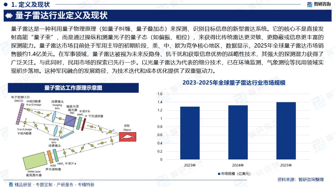 量子雷达是一种利用量子物理原理(如量子纠缠、量子叠加态)来探测、识别目标信息的新型雷达系统。它的核心不是直接发射高能“量子束”,而是通过操纵和测量光子的量子态(如偏振、相位),来获得比传统雷达更灵敏、更隐蔽或信息更丰富的探测能力。量子雷达市场目前处于军用主导的初期阶段,美、中、欧为竞争核心地区,数据显示,2025年全球量子雷达市场销售额约1.4亿美元。在军事领域,量子雷达被视为未来反隐身、抗干扰和获取信息优势的战略性技术,其强大的探测潜力获得了广泛关注。与此同时,民用市场的探索已先行一步。以光量子雷达为代表的细分技术,已在环境监测、气象测绘等民用领域实现初步落地。这种军民融合的发展路径,为技术迭代和成本优化提供了双重驱动力。