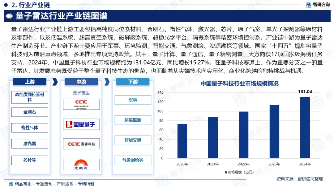 行业发展有利因素:国家“十四五”规划将量子科技列为前沿重点领域,多地推出专项支持政策,量子计算、通信、精密测量三大方向获17项国家级揭榜任务支持,2024年量子科技整体市场规模达131.04亿元。产业链协同方面,上游核心部件(如激光器、单光子探测器)国产化率提升,中游制造环节形成完整链条,下游应用场景(军事、环保、智能交通)持续拓展,军民融合路径加速技术迭代与成本优化。