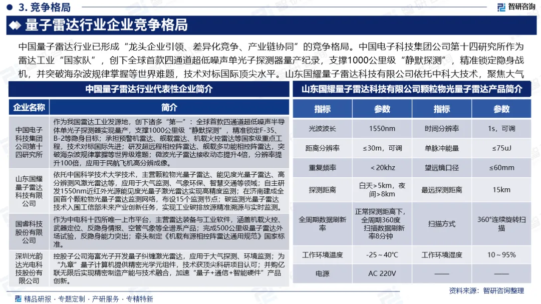 竞争情况:中国量子雷达行业已形成“龙头企业引领、差异化竞争、产业链协同”的竞争格局。中国电子科技集团公司第十四研究所作为雷达工业“国家队”,创下全球首款四通道超低噪声单光子探测器量产纪录,支撑1000公里级“静默探测”,精准锁定隐身战机,并突破海杂波规律掌握等世界难题,技术对标国际顶尖水平。山东国耀量子雷达科技有限公司依托中科大技术,聚焦大气监测领域,建成济南颗粒物光量子雷达监测网络。