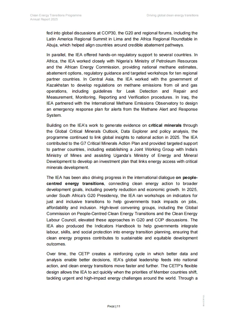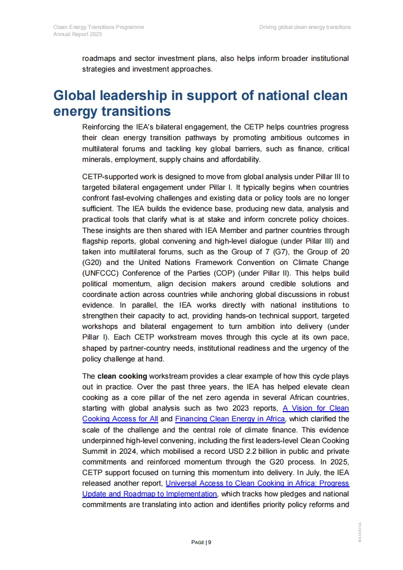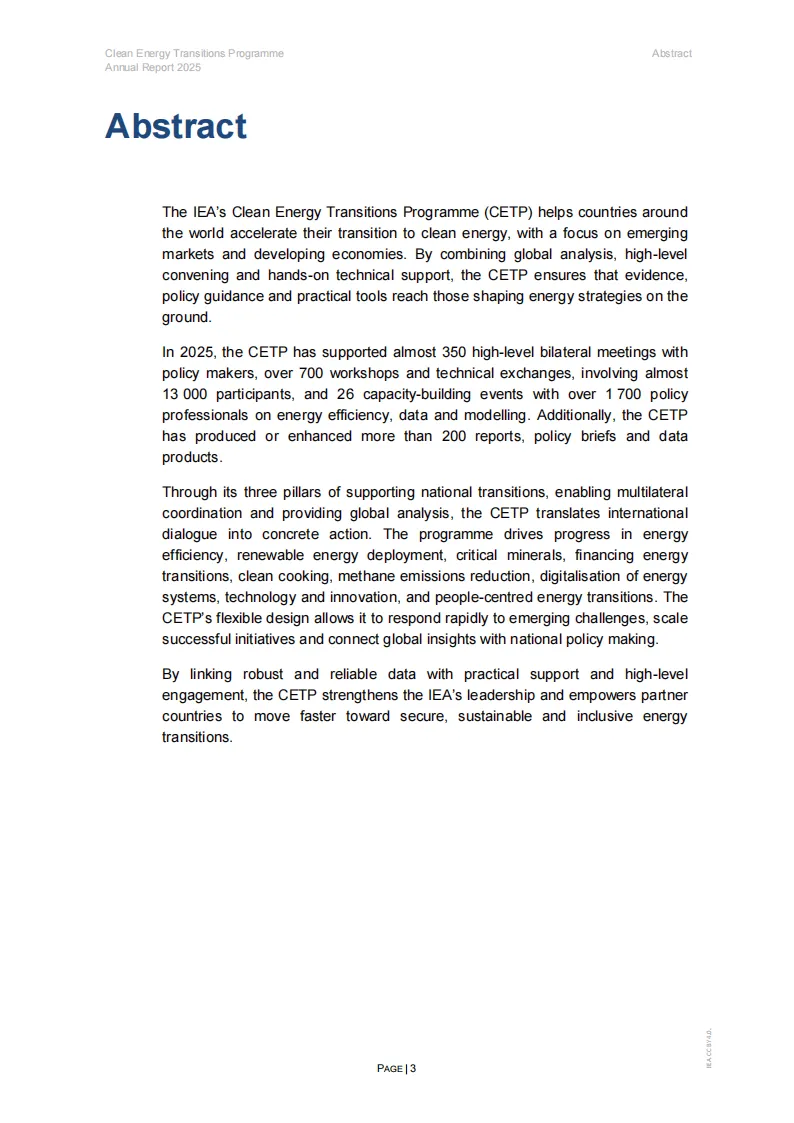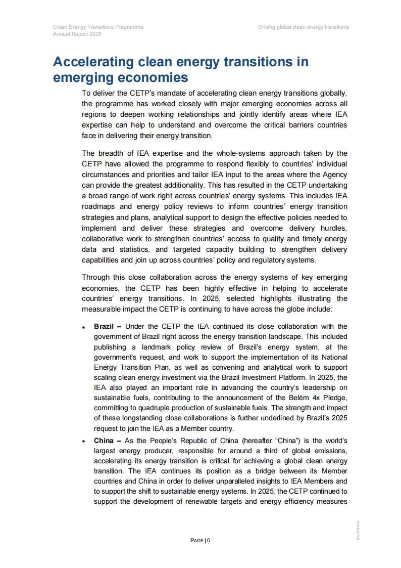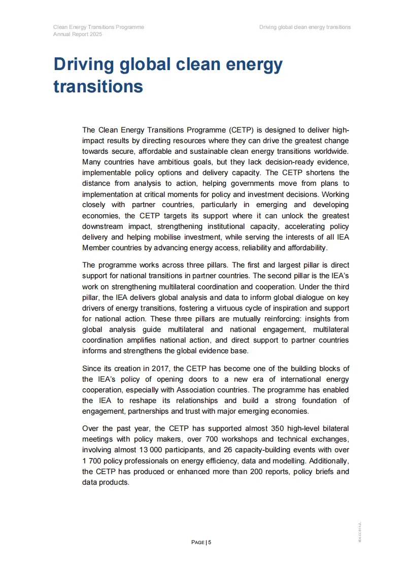 国际能源署(IEA)的清洁能源转型计划(CETP)2025年度报告,聚焦全球清洁能源转型进程,通过三大支柱性工作推动各国向安全、可负担、可持续的能源体系转型,尤其侧重新兴市场和发展中经济体的转型需求。