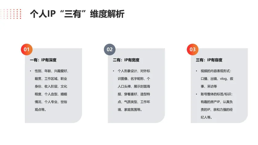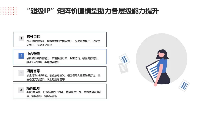 这份抖音本地生活服务房产直播运营培训教程,核心围绕房产差异化短视频达人IP打造、账号矩阵搭建及爆款内容创作展开,为房产新媒体运营提供了从基础搭建到专业进阶的全流程思路。教程指出,房产自有达人进阶分为起步、规范、专业三大阶段,核心是搭建并优化“超级IP”账号矩阵,矩阵涵盖万科地产类官号、中台账号、区域城市项目官号及销售/经纪人个人账号等层级,各账号分工明确,官号主打品牌与大型活动宣发,中台账号侧重多形式楼盘内容输出,项目官号聚焦精准拓客与线上看房,矩阵账号则负责品牌扩散、直播解疑和留咨拓客,层层配合实现流量与线索的高效转化。