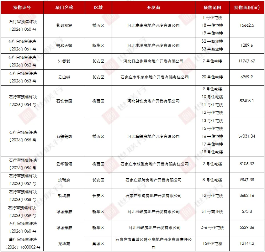 2026年3月,石家庄市行政审批局及各区域政府网站新增预售许可证公示24个,由长安区、桥西区、裕华区、新华区、藁城区、正定新区供应。