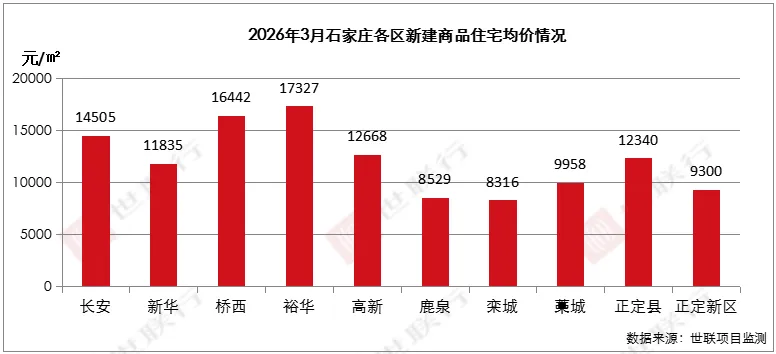 分区域价格方面,裕华区居于首位,为17327元/㎡;其次为桥西区,为16442元/㎡。(注:价格以普通住宅为主)