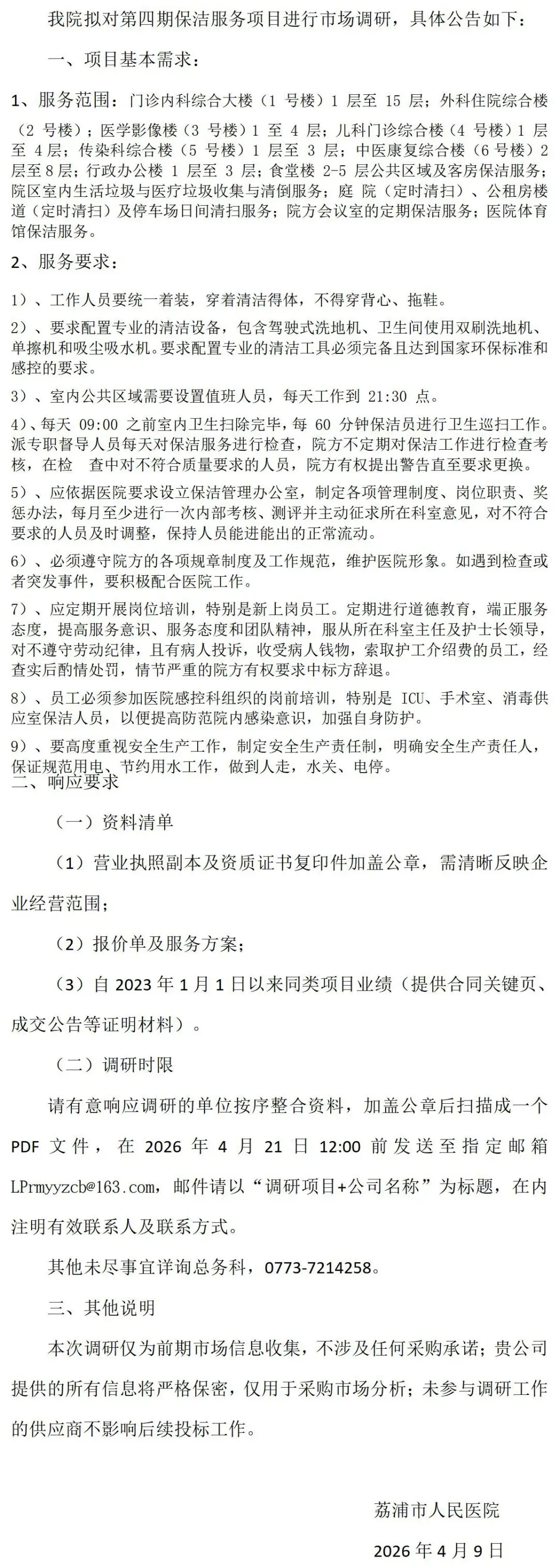 荔浦市人民医院第四期保洁服务项目市场调研公告