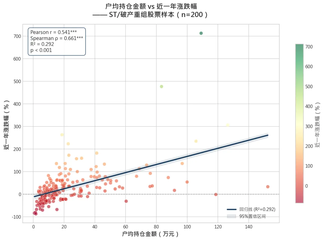 本报告针对201只ST及破产重整股票样本(包含ST板块/法拍股/个人关注股),基于公开数据,构建了"户均持仓金额"与"近一年涨跌幅"之间的量化关系模型。户均持仓金额是预测ST/重整股票未来表现的最强单一指标之一,Pearson相关系数达0.54(p<0.001),Q5组 vs Q1组超额收益达129个百分点。