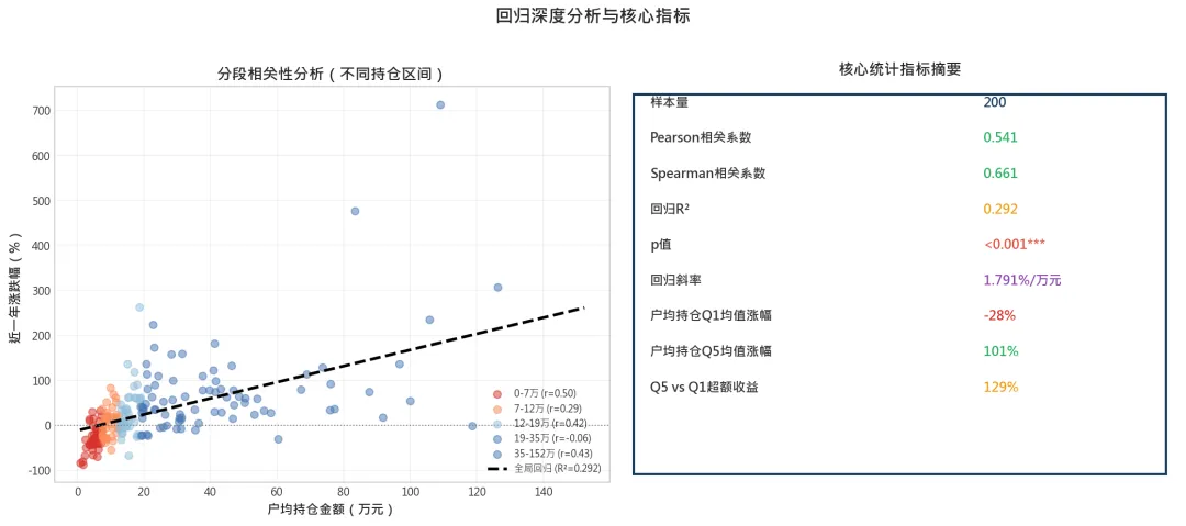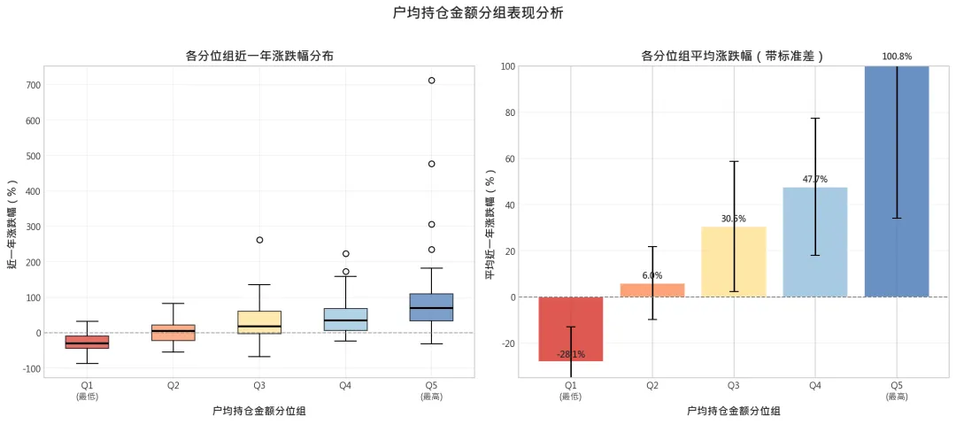 关键洞察:从Q1→Q5,呈现单调递增的收益阶梯,无一是偶然。Q5组(户均持仓>65万)平均涨幅超过100%,而Q1组平均亏损28%——两者差距高达129个百分点。