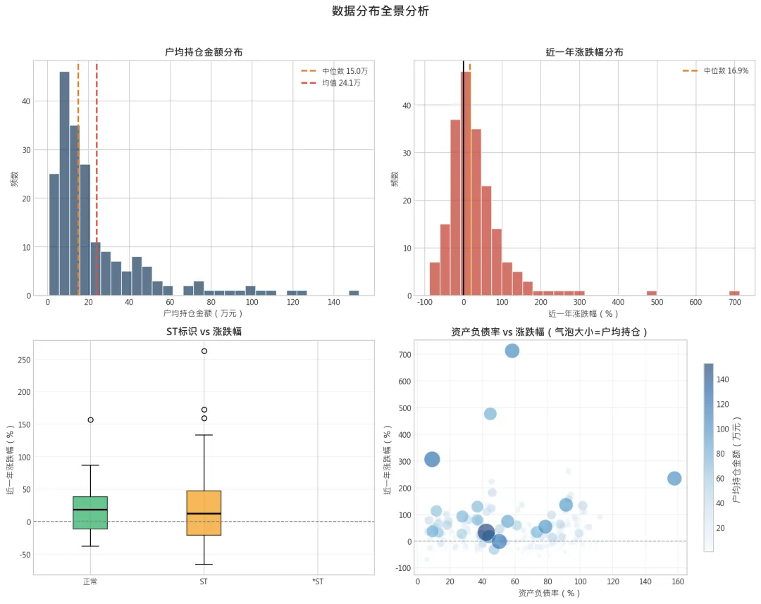 图3:数据分布全景(持仓/涨跌幅/ST分类/资产负债率)
