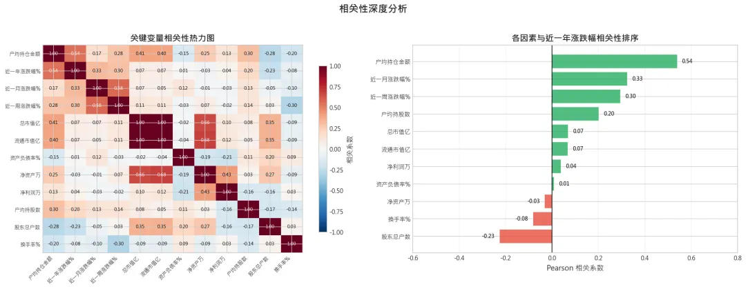 解读:户均持仓金额以0.541的相关系数远超其他变量,是预测收益的首要因子。股东总户数(-0.31)与收益负相关,与户均持仓呈镜像逻辑。