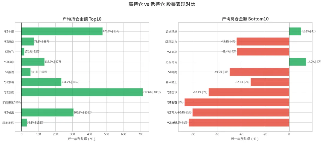观察:Bottom 10几乎清一色为小市值、高风险的ST/*ST股,户均持仓极低(<4万)往往意味着股东户数众多、筹码高度分散、主力控盘程度弱。