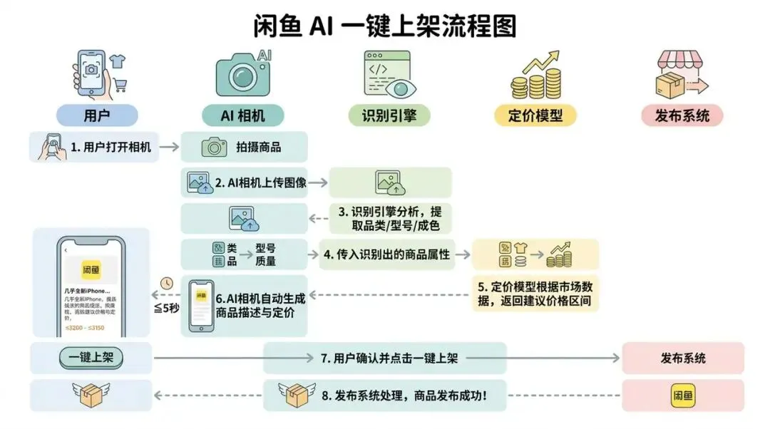 她跟我说,那是闲鱼新出的功能,叫“AI相机”。不用打字,不用查行情,对着东西随手一拍,五秒钟,标题、描述、价格全给你自动生成好了。