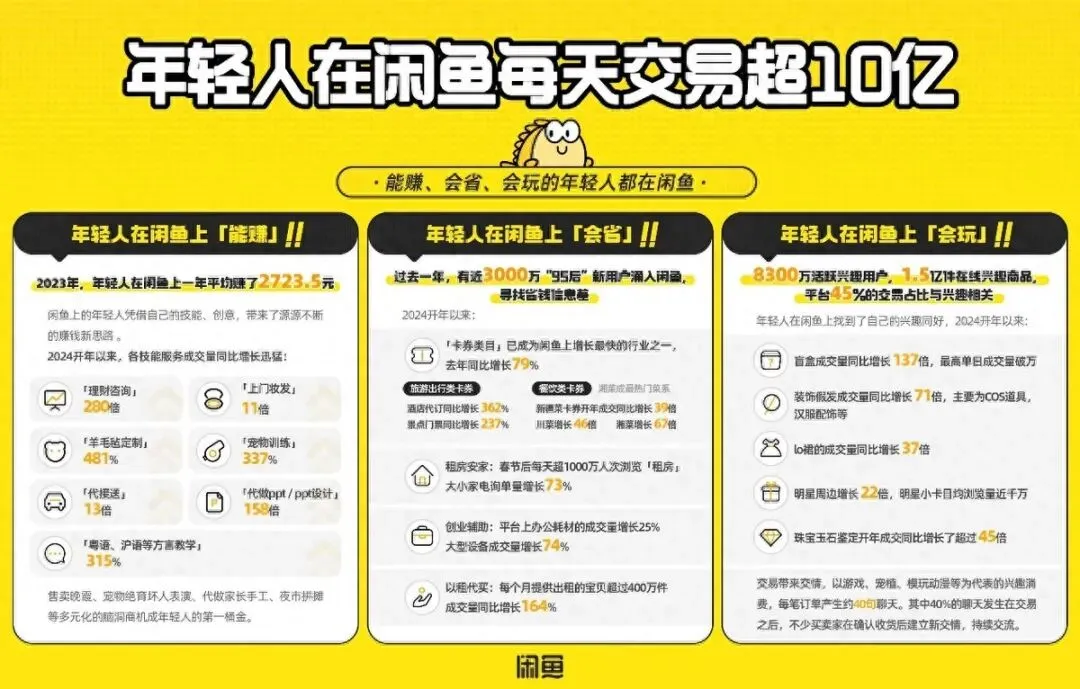 我斗胆猜一下,闲鱼自己的年交易额,恐怕早就是千亿级别的了。你想想,光是我身边——公司小姑娘卖挂件、退休大爷卖按摩椅、程序员卖龙虾咨询……这些“毛细血管”一样的小生意,汇到一起,那就是条大河。