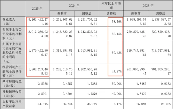 2025年天孚通信(300394.SZ)营收51.63亿元,同比增长58.79%;归母净利润20.17亿元,同比增长50.15%;扣非净利润19.76亿元,同比增长50.42%。