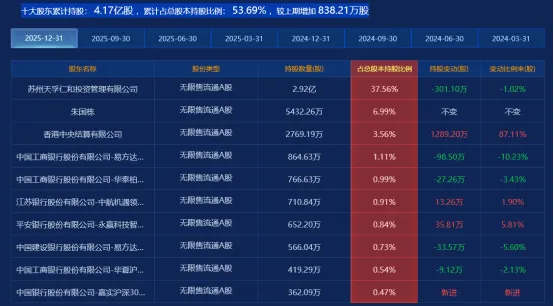天孚通信(300394.SZ)股东格局清晰,控股股东为苏州天孚仁和投资管理有限公司,与实际控制人、总经理欧洋为一致行动人,2025年末合计持股约37.56%,由创始人团队主导经营,无“一言堂”问题,前十大流通股东结构多元,包含机构资金。