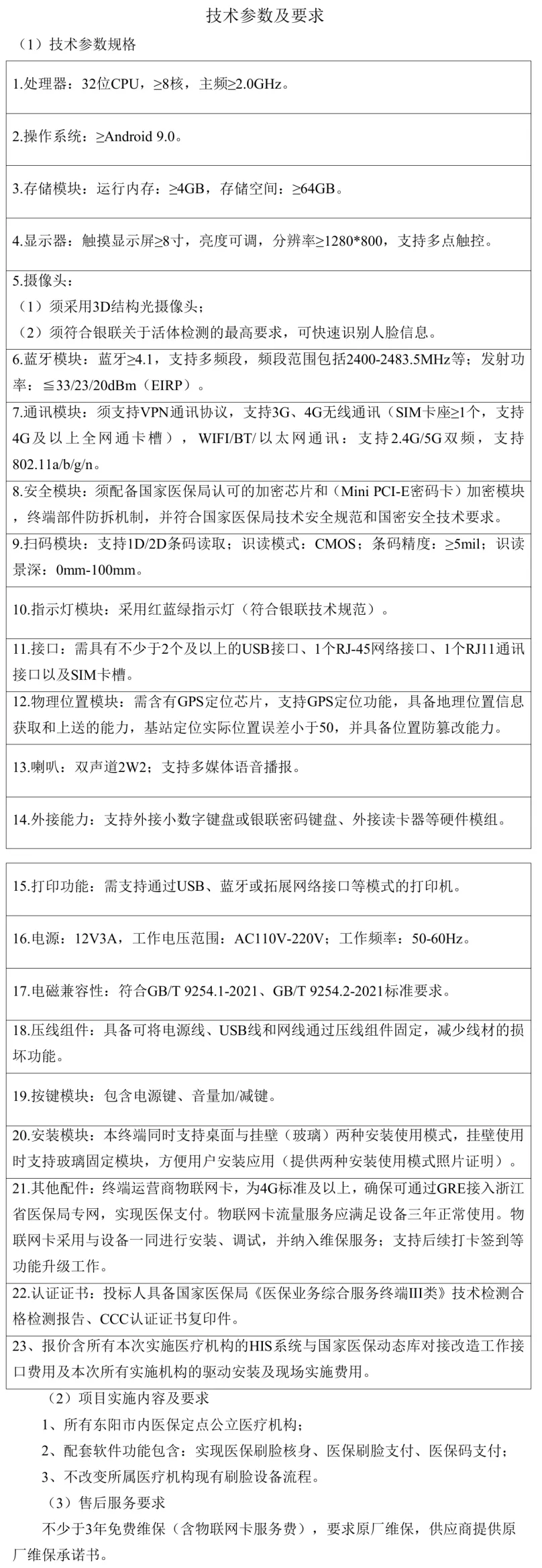 1.招标内容:医保业务综合服务终端,数量:155台(含物联网卡),实现医保刷脸核身、医保刷脸支付、医保码支付;