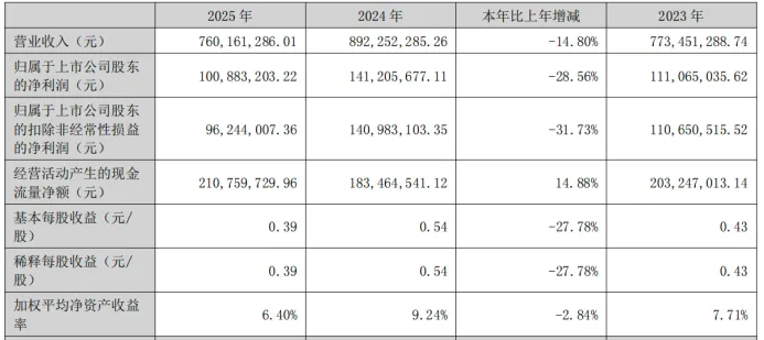 2025年,金富科技实现营业收入7.60亿元,同比下降14.80%;归母净利润1.01亿元,同比下降28.56%;扣非净利润9624.4万元,同比下降31.73%,三大核心盈利指标全线走低,且下滑幅度较前三季度进一步扩大。