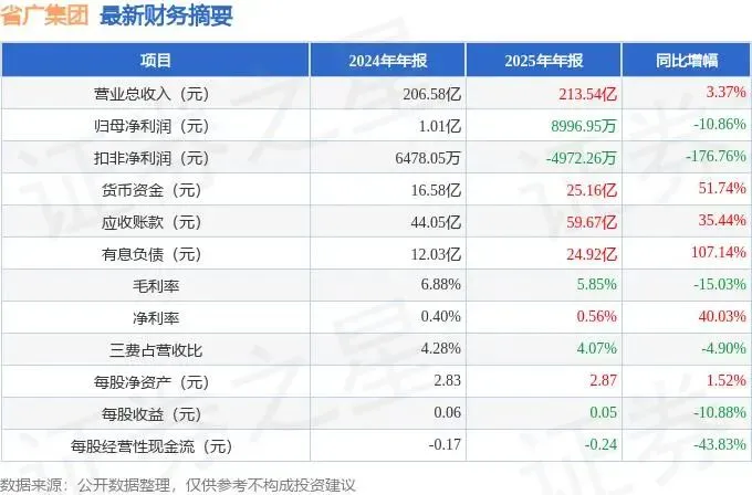 3月30日,省广集团发布2025年年报。报告显示,公司2025年营业收入为213.54亿元,同比增长3.37%;归母净利润为8996.95万元,同比下降10.86%;扣非归母净利润为-4972.26万元,同比下降176.76%;基本每股收益0.05元。