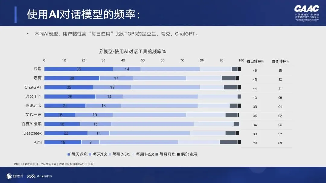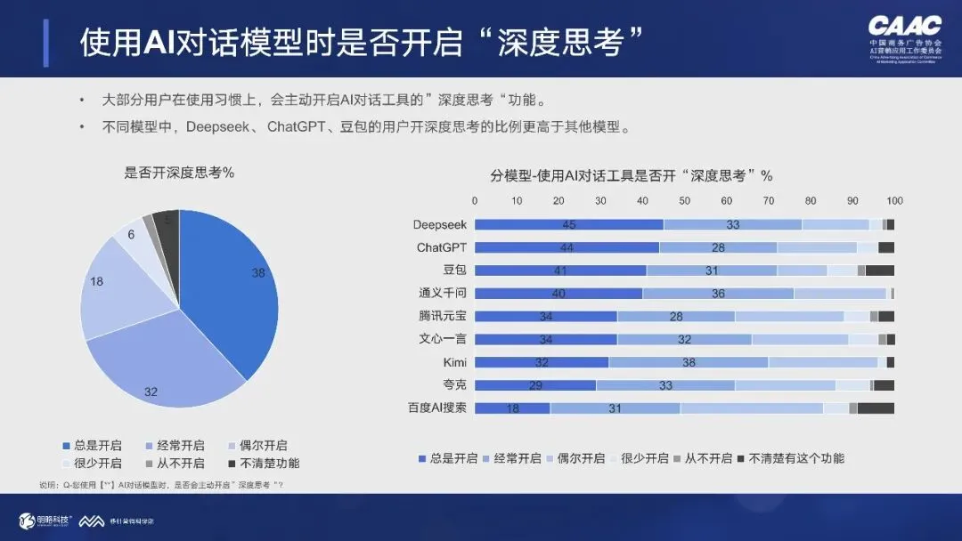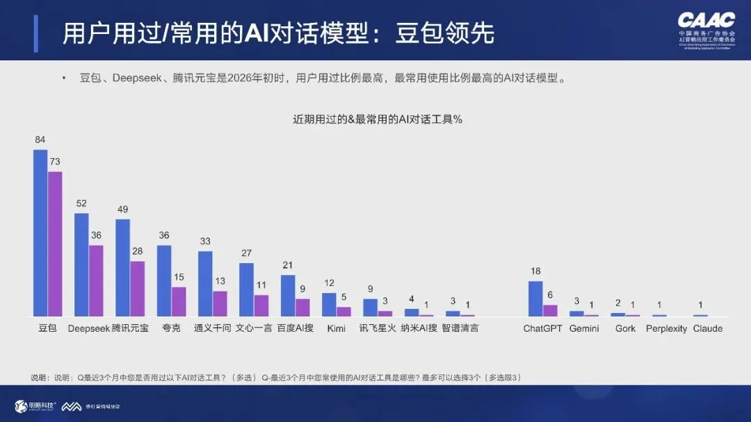 普及程度:2026年初,超60%用户对AI有较高了解度,87%用户使用技能达熟练及以上水平,AI对话工具已成为大众化工具。 主流工具:豆包在用户使用率、常用度与日活粘性上领先,DeepSeek、腾讯元宝紧随其后;77%用户通过移动端APP使用(元宝、豆包为主)。 使用习惯:55%用户使用时长超6个月,38%用户每周使用3-5次,27%每日多次;42%用户常查看AI引用链接(ChatGPT、豆包用户更突出)。 功能偏好:超半数用户主动开启联网搜索与深度思考功能(DeepSeek、豆包用户更显著),纯消费场景使用占比29%。