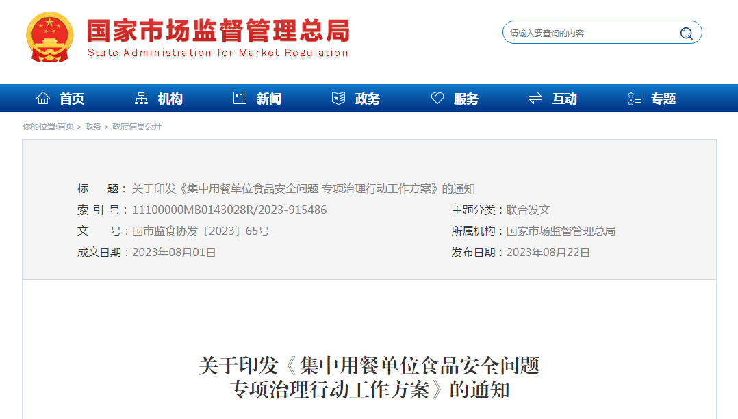 为进一步规范学校(含托幼机构,下同)、医院、养老院、机关等集中用餐单位食堂经营管理,防范化解风险隐患,全面提升集中用餐单位食品安全水平,市场监管总局会同教育部、民政部、国家卫生健康委、国管局等相关部门决定自即日起至2023年年底,开展集中用餐单位食品安全问题专项治理行动。现制定如下工作方案。(一)指导思想。以习近平新时代中国特色社会主义思想为指导,牢固树立以人民为中心的发展思想,坚决贯彻落实“四个最严”要求,进一步压紧压实各方责任,健全制度机制,强化协调联动,严格监管执法,提升集中用餐单位食品安全管理水平,有效遏制集中用餐单位食品安全事件频发势头,切实保障集中用餐群众饮食安全。压实责任、协同发力。厘清行业主管部门、综合监管部门职责和属地管理责任,强化联合惩戒,协调联动,同向发力,严格落实企业主体责任。问题导向、严字当头。紧盯集中用餐单位食品安全突出问题开展专项治理,严格监管执法,严厉处罚到人,严肃追责问责,形成高压态势,推动集中用餐单位食堂违法违规行为明显减少。标本兼治、综合施策。在专项治理基础上举一反三、多措并举、系统推进,突出治本之策,针对深层次问题,完善制度机制,健全常态化治理体系。社会监督、多元共治。广泛调动消费者、媒体等参与食品安全监督的积极性,进一步提升社会公众参与度;指导行业协会共同推动企业加强自律、规范发展;利用“互联网+明厨亮灶”等手段,不断提升社会监督效能。(三)工作目标。通过开展专项治理行动,着力解决集中用餐单位食品安全管理不规范、制度执行不到位、厨房环境不卫生、食品安全事件多发等突出问题,推动集中用餐单位及其承包经营企业管理明显规范,从业人员食品安全意识明显增强,环境卫生明显改善,重大食品安全事件明显减少,逐步建立长效制度机制,不断提升集中用餐单位食品安全水平。(一)严格落实企业(单位)主体责任。各地市场监管部门和相关主管部门,要督促集中用餐单位及其食堂承包经营企业建立健全人员管理、进货查验、加工操作、食品留样、信息公开等各项食品安全管理制度,制定《食品安全风险管控清单》《食品安全总监职责》《食品安全员守则》;依法依规设立食品安全管理机构,配备食品安全总监和食品安全员,设置率力争达到100%;严格执行食品安全“日管控、周排查、月调度”制度,执行率力争达到100%;开展从业人员食品安全培训考核,培训考核率力争达到100%。(市场监管总局牵头,教育部、民政部、国家卫生健康委、国管局配合)1. 严把许可准入关。加强学校、医院、养老院、机关等集中用餐单位食堂分类统计、动态管理。严格食品经营许可管理,重点加强食品安全管理机构和人员、食品安全管理制度、设施设备布局、清洗消毒、环境卫生等项目审查和现场核查。对新获得食品经营许可证的单位食堂,必须在获证后3个月内对其开展一次监督检查。上级地方市场监管部门对下级地方市场监管部门许可工作质量随机开展抽查,抽查比例不得低于新获证单位食堂数量的5%。(市场监管总局负责)2. 严格环境卫生和过程监管。针对通风、防蝇防鼠防虫、冷藏冷冻等设备设施,库房、操作间、分餐间等关键场地场所,严格按照频次、监督检查操作指南等要求,加大检查力度,着力解决餐饮环境脏乱差问题。针对晨检、食物储存、餐饮具清洗消毒、加工操作、食品留样、剩余食品处置等重点环节,对照《食品安全国家标准 餐饮服务通用卫生规范》(GB31654—2021)和《餐饮服务食品安全操作规范》等要求,重点检查索证索票、进货查验、从业人员健康管理、食品留样等制度落实情况。对发现的问题建立问题清单,督促限期全部整改。(市场监管总局牵头,相关部门配合)3. 严管承包经营行为。重点排查承包经营企业以及承包经营的食堂是否取得相应经营资质,是否依法签订承包经营合同,是否落实食品安全管理制度并履行食品安全责任,是否依照法律、法规、规章、食品安全标准以及合同约定进行经营。(市场监管总局牵头,相关部门配合)4. 严惩违法违规行为。建立健全集中用餐单位食堂食品安全问题发现机制,畅通“12315”等投诉举报渠道,发挥“食堂吹哨人”监督作用,鼓励消费者和学生家长“随手拍”,对提供重大违法行为线索的,按规定给予相应奖励。对检查发现集中用餐单位食堂及其承包经营企业存在经营腐败变质、油脂酸败、霉变生虫、污秽不洁、混有异物、掺假掺杂或者感官性状异常食品等违法违规行为的,一律从速从严从重处罚,对主要负责人顶格处罚,涉嫌犯罪的移送公安机关,结案后一律依法依规公开曝光。(市场监管总局牵头,相关部门配合)1. 严抓日常管理。各类集中用餐单位主管部门每年必须对集中用餐单位进行全覆盖检查,指导和督促其建立健全食品安全相关管理制度,将强化集中用餐单位食堂食品安全作为落实行业安全风险防控职责的重要内容,加强评价考核;指导、监督集中用餐单位加强食品安全教育和日常管理,降低食品安全风险,及时消除隐患,积极协助食品安全监管部门开展工作;对发生食品安全事故,擅离职守或者不按规定报告、不采取措施处置或者处置不力的,给予集中用餐单位食品安全的相关工作人员、相关负责人警告或者记过处分;情节较重的,给予降