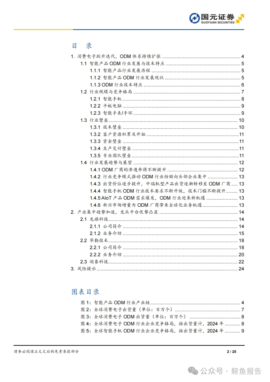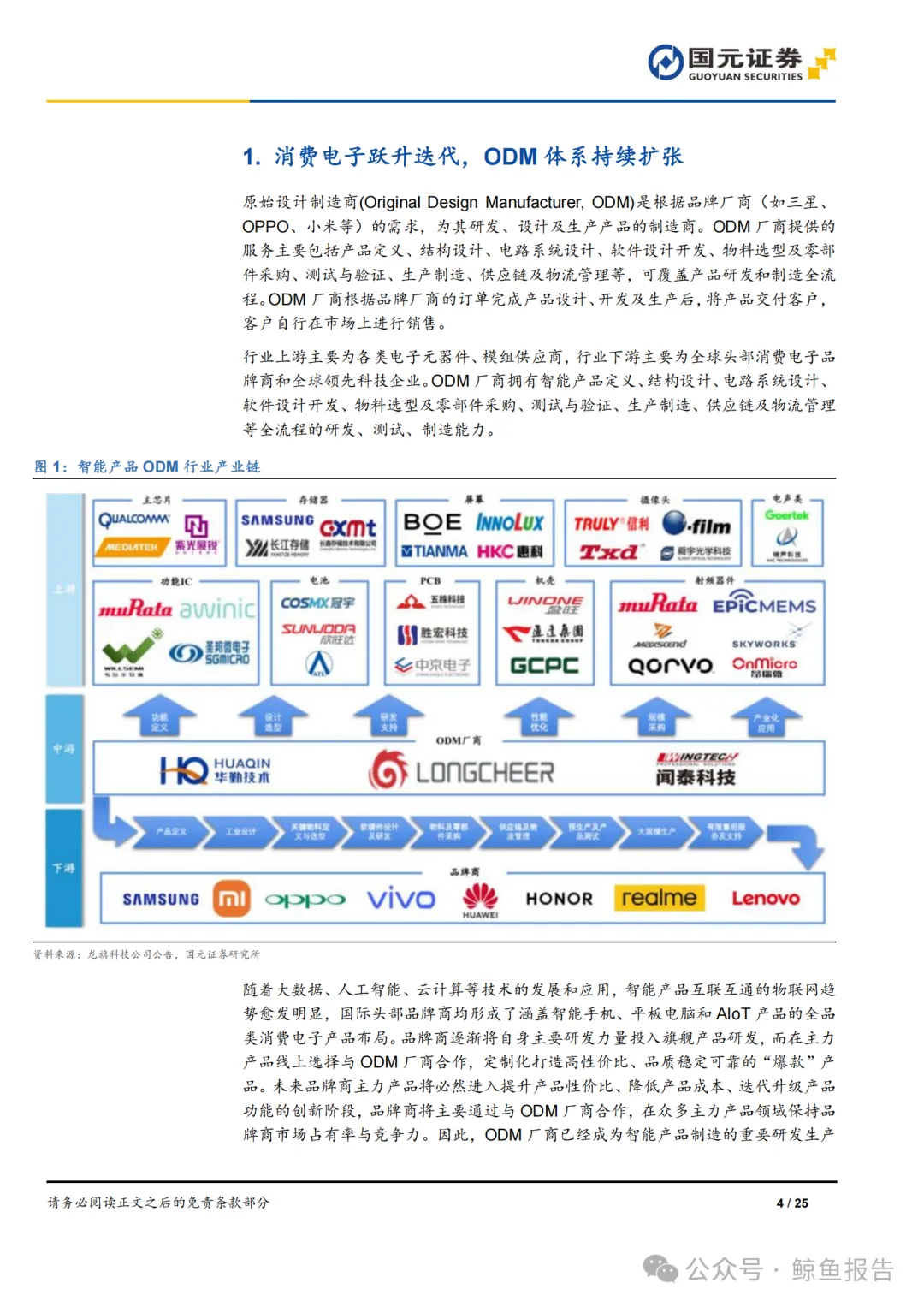 原始设计制造商(Original Design Manufacturer, ODM)是根据品牌厂商(如三星、 OPPO、小米等)的需求,为其研发、设计及生产产品的制造商。ODM 厂商提供的 服务主要包括产品定义、结构设计、电路系统设计、软件设计开发、物料选型及零部 件采购、测试与验证、生产制造、供应链及物流管理等,可覆盖产品研发和制造全流 程。ODM 厂商根据品牌厂商的订单完成产品设计、开发及生产后,将产品交付客户, 客户自行在市场上进行销售。 行业上游主要为各类电子元器件、模组供应商,行业下游主要为全球头部消费电子品 牌商和全球领先科技企业。ODM 厂商拥有智能产品定义、结构设计、电路系统设计、 软件设计开发、物料选型及零部件采购、测试与验证、生产制造、供应链及物流管理 等全流程的研发、测试、制造能力。