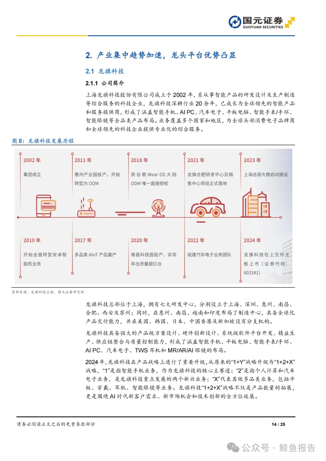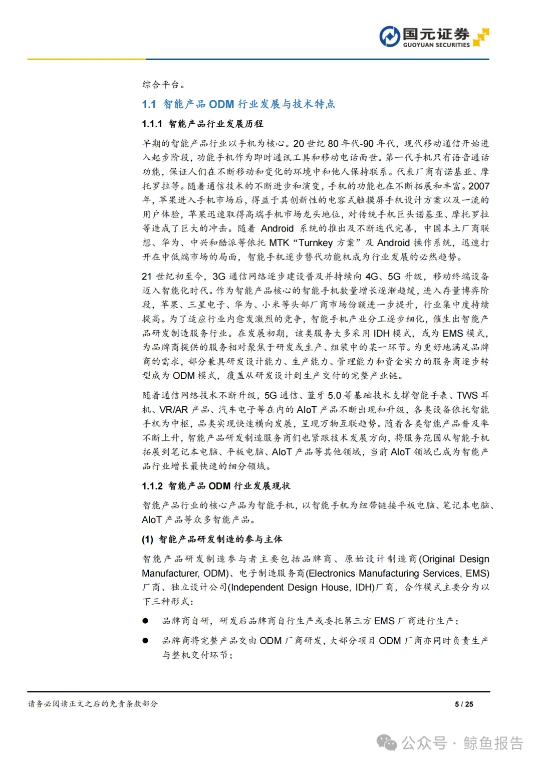 早期的智能产品行业以手机为核心。20 世纪 80 年代-90 年代,现代移动通信开始进 入起步阶段,功能手机作为即时通讯工具和移动电话面世。第一代手机只有语音通话 功能,保证人们在不断移动和变化的环境中和他人保持联系。代表厂商有诺基亚、摩 托罗拉等。随着通信技术的不断进步和演变,手机的功能也在不断拓展和丰富。2007 年,苹果进入手机市场后,得益于其创新性的电容式触摸屏手机设计方案以及一流的 用户体验,苹果迅速取得高端手机市场龙头地位,对传统手机巨头诺基亚、摩托罗拉 等造成了巨大的冲击。随着 Android 系统的推出及不断迭代完善,中国本土厂商联 想、华为、中兴和酷派等依托 MTK“Turnkey 方案”及 Android 操作系统,迅速打 开在中低端市场的局面,智能手机逐步替代功能机成为行业发展的必然趋势。 21 世纪初至今,3G 通信网络逐步建设普及并持续向 4G、5G 升级,移动终端设备 迈入智能化时代。作为智能产品核心的智能手机数量增长逐渐趋缓,进入存量博弈阶 段,苹果、三星电子、华为、小米等头部厂商市场份额进一步提升,行业集中度持续 提高。为了适应行业内愈发激烈的竞争,智能手机产业分工逐步细化,催生出智能产 品研发制造服务行业。在发展初期,该类服务大多采用 IDH 模式,或为 EMS 模式, 为品牌商提供的服务相对聚焦于研发或生产、组装中的某一环节。为更好地满足品牌 商的需求,部分兼具研发设计能力、生产能力、管理能力和资金实力的服务商逐步转 型成为 ODM 模式,覆盖从研发设计到生产交付的完整产业链。 随着通信网络技术不断升级,5G 通信、蓝牙 5.0 等基础技术支撑智能手表、TWS 耳 机、VR/AR 产品、汽车电子等在内的 AIoT 产品不断出现和升级,各类设备依托智能 手机为中枢,品类实现快速横向发展,呈现万物互联趋势。随着各类智能产品普及率 不断上升,智能产品研发制造服务商们也紧跟技术发展方向,将服务范围从智能手机 拓展到笔记本电脑、平板电脑、AIoT 产品等其他领域,当前 AIoT 领域已成为智能产 品行业增长最快速的细分领域。