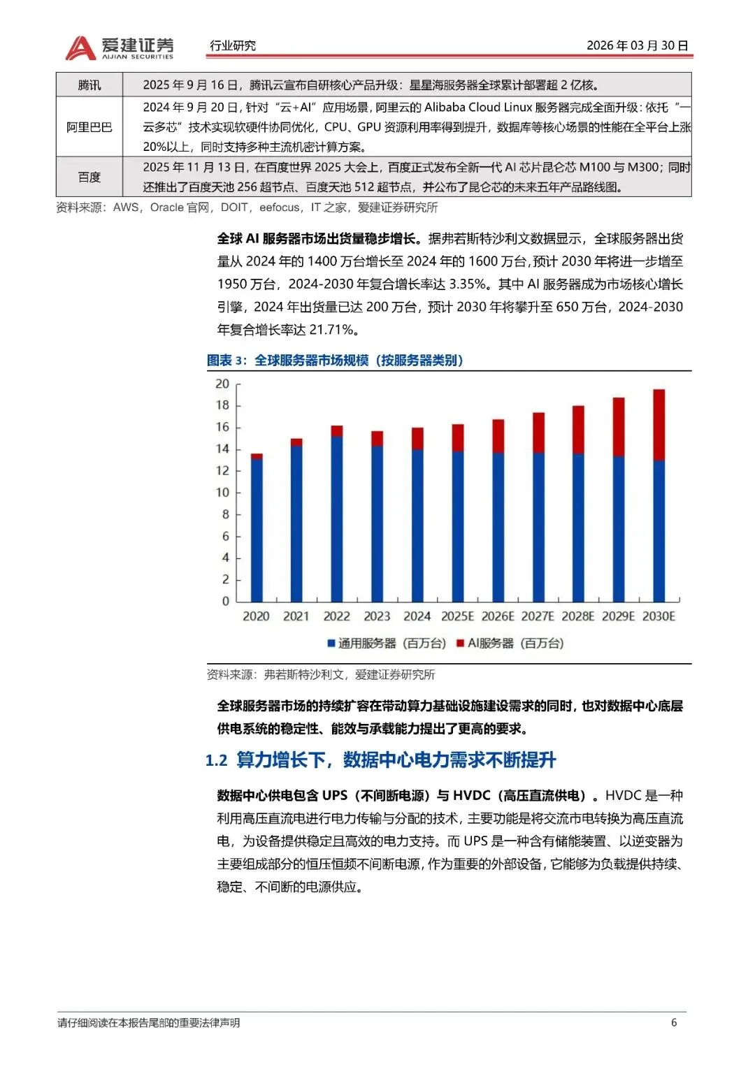 TrendForce数据显示,Google、AWS、Meta、Microsoft、Orace、腾讯、阿里、百度的合计资本开支,从2021年的1451亿美元增长至2024年的2609亿美元,2021-2024年复合增长率达21.6%;该机构进一步预测,2026年全球八大大云广商资本开支有望达到7100亿美元,2024-2026年复合增长率或将达到65.0%。这一趋势带动服务器扩容需求激增,据弗若斯特沙利文数据,全球服务器出货量从2021年的1400万台增长至2024年的1600万台,预计2030年将进一步增至1950万台,2024-2030年复合增长率为3.35%。其中Al服务器成为市场核心增长引擎,2024年出货量已达200万台,预计2030年将攀升至650万台,2024-2030年复合增长率达21.71%。